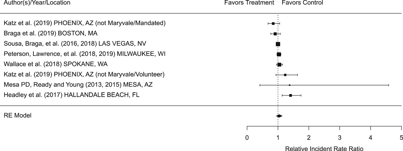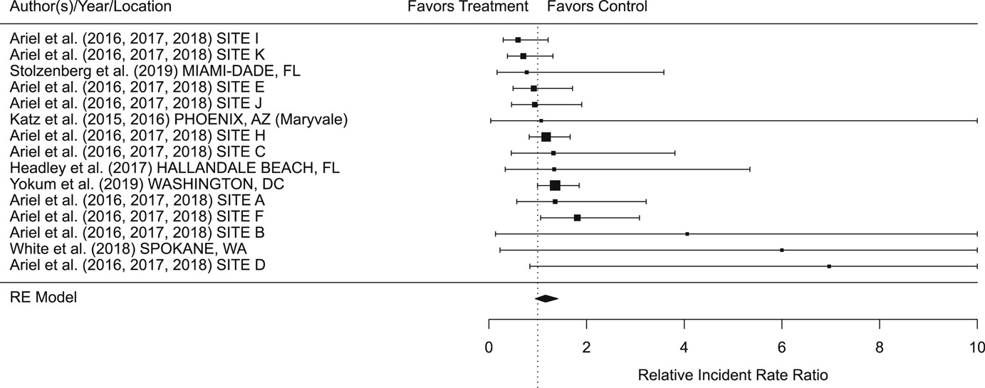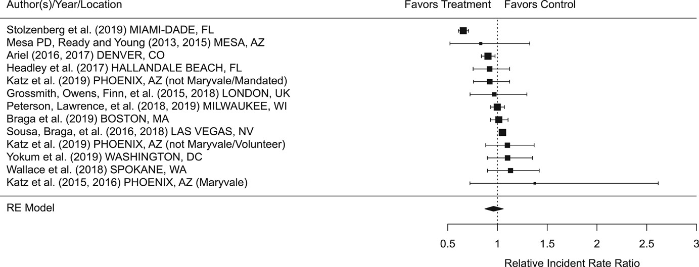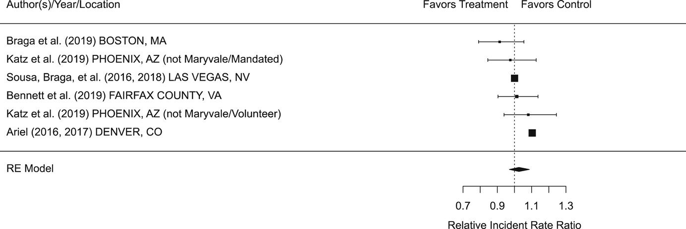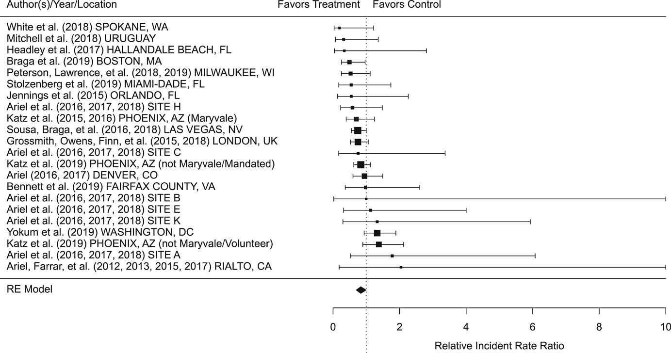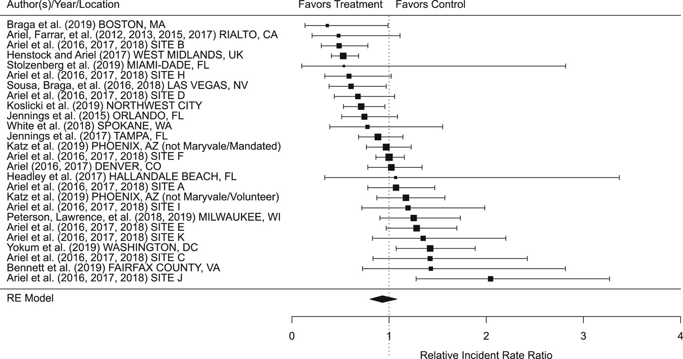2020) characterize Lum et al.'s assessment as “gloomy” (p. 13). They suggest that other reviews, including their own assessment from their collection of outcomes for the U.S. Department of Justice BWC Policy and Implementation Program (see White, Gaub, & Padilla, 2019a,