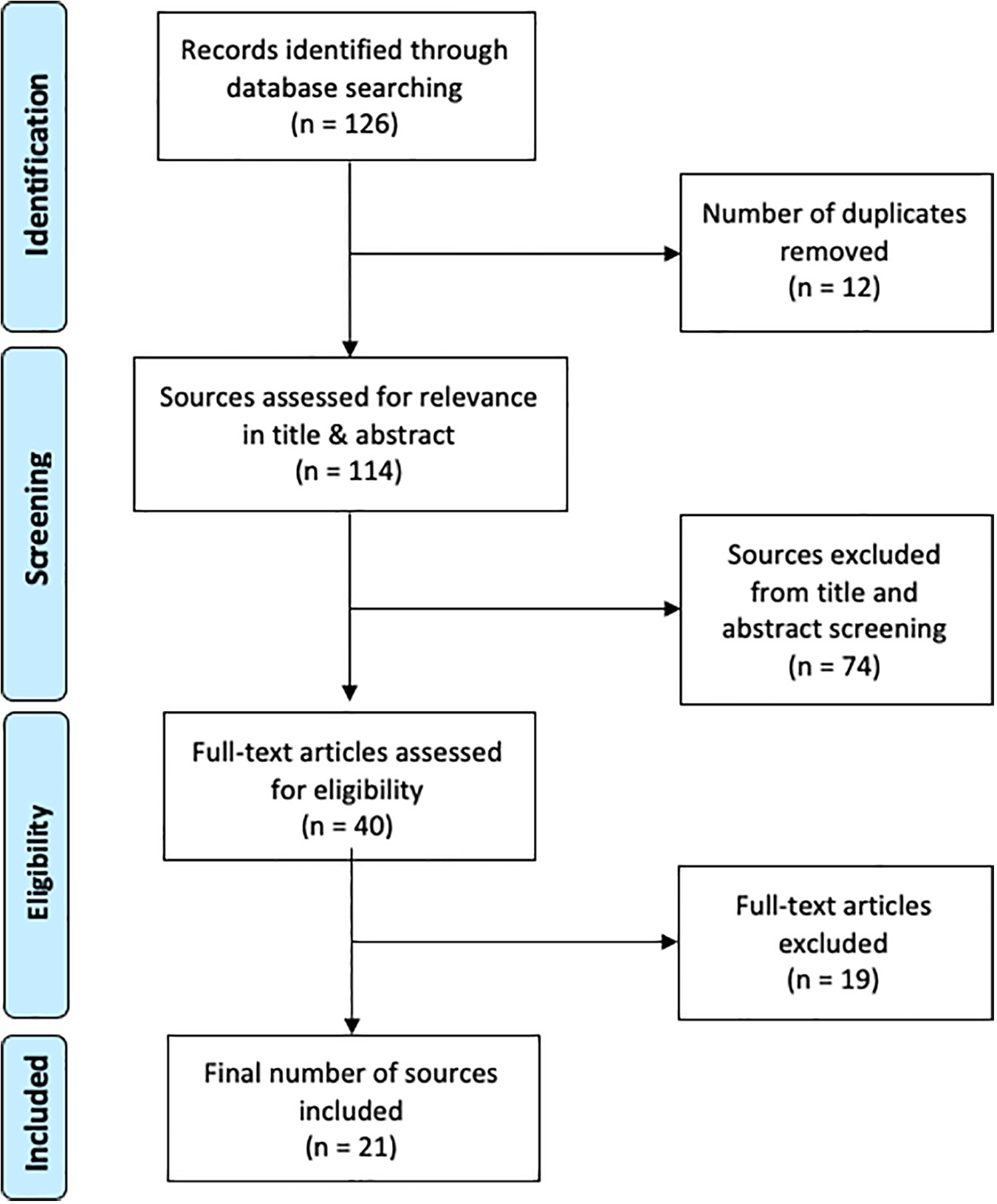 The initial search across all three databases yielded 126 potential sources. Studies for inclusion in the review were selected through two screening stages: one of the titles and abstracts of gathered studies, and one of the full texts. One reviewer screened the title and abstract of each source. Studies were included if they were (1) primary research articles, (2) contained the term “palliative care” or “end-of-life care” in the title or abstract, and (3) conducted in Canada between 2008 and 2018. This latter criterion was included to capture a recent picture (i.e., within 10 years of the review date) of how culture is discussed in palliative care literature, and to ensure that the discussion of terms used to refer to culture in care was relevant to current practice. Non-English studies were excluded. In this review, sources were not included or excluded based on source methodology.