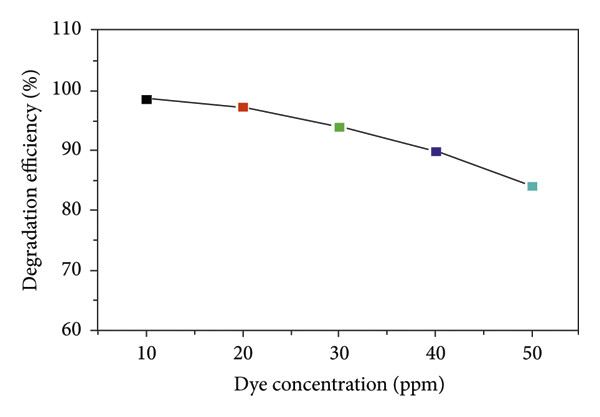 The degradation efficiency of RhB was examined by varying the concentration of RhB dye from 10 ppm to 50 ppm. Degradation efficiency of catalyst decreased with the increase in concentration of RhB as shown in Figure 9(f).