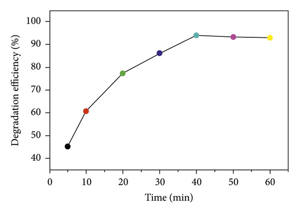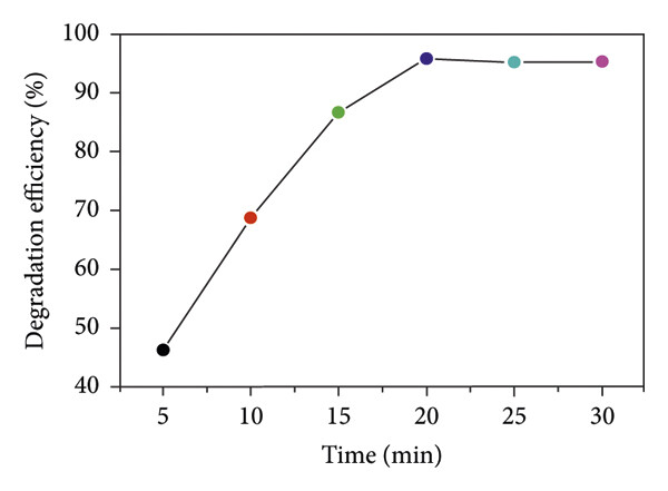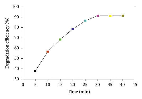Photodegradation of rhodamine B with the CuNi/Bi2MoO6 photocatalyst was studied at different time intervals from 5 to 40 minutes at pH 10 under visible light to optime the catalytic activity. The absorbance peak of RhB at maximum wavelength expeditiously declined with increase in exposure time accompanied by gradual decolorization of solution (Figure 9(c)). Electron transfer rate from valance band to conduction band increases, which is responsible for higher photocatalytic efficiency [40]. RhB was absolutely degraded after 30 minutes, so it was considered as optimum time. Figure 9(d) shows influence of time on percentage degradation efficiency of rhodamine B.