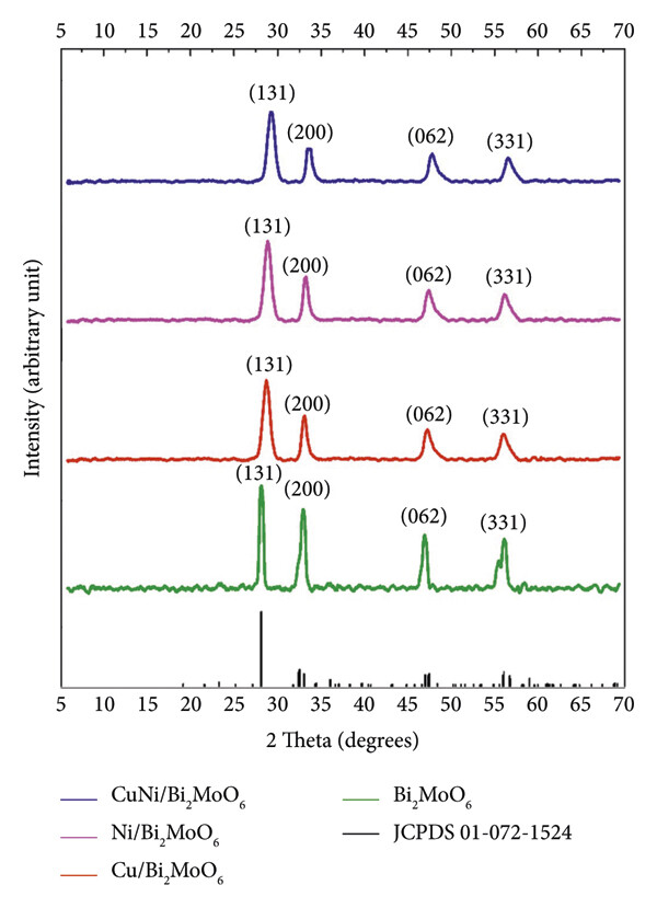 XRD patterns of fabricated materials are shown in Figure 1. The orthorhombic geometry of Bi2MoO6 is represented by sharp peaks in the diffraction pattern at 28.11°, 32.98°, 46.96°, and 56.11°, which are related to (131), (200), (062), and (331) crystallographic planes, respectively. These results are consistent with JCPDS card number 01‐072‐1524 and previous reports [16]. No diffraction peak appeared due to transition metal ions or any other impurity which confirms that same geometry is present in all the samples, and it also indicates that all the dopant may have entered into the lattice.