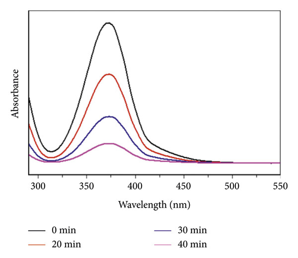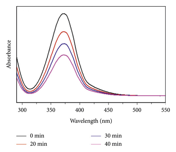 Photocatalytic ability of CuNi/BMO for the reduction of hexavalent chromium to trivalent chromium was determined by UV‐Vis spectrophotometry, and it was proved to be an excellent reducing agent. Aqueous solution of potassium dichromate was used as a source of Cr(VI). Hole scavengers are generally used for efficient reduction of heavy metals; in this work, formic acid was employed as the hole scavenger. Role of formic acid on reduction of hexavalent chromium was confirmed through various ways; firstly, formic acid was used solely as reducing agent but there was no significant reduction even after 24 hours as shown in Figure 6. It indicates that formic acid is incapable to reduce Cr(VI) completely in the absence of catalyst. Similarly, Cr(VI) reduction using CuNi/BMO was examined with and without formic acid as shown in Figures 7(a) and 7(b). It was concluded that CuNi/BMO did not completely reduce the hexavalent chromium while its performance incredibly enhanced when formic acid was also added to reaction solution.