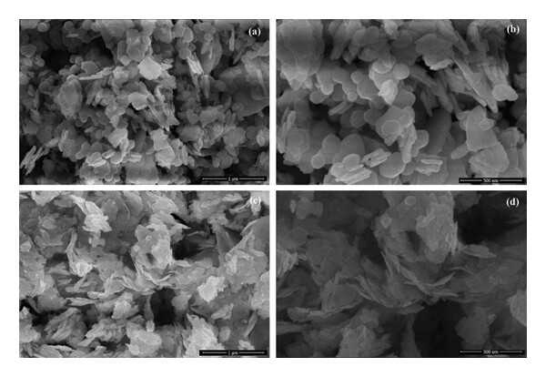 SEM images of pristine Bi2MoO6 and Cu‐Ni/Bi2MoO6 were obtained for the comparison of surface morphologies as shown in Figures 3(a)–3(d) at different resolutions. It can be seen that BMO is made up of irregular shaped and globular nanoparticles but Cu‐Ni/BMO has flowerlike microspheres which are aggregated by nanosheets [20]. Modified BMO exhibited fluffy appearance attributed to surface roughness, which may be responsible for increased contact area resulting in enhanced photocatalytic activity.