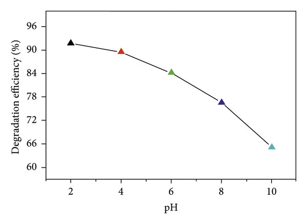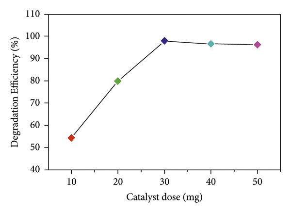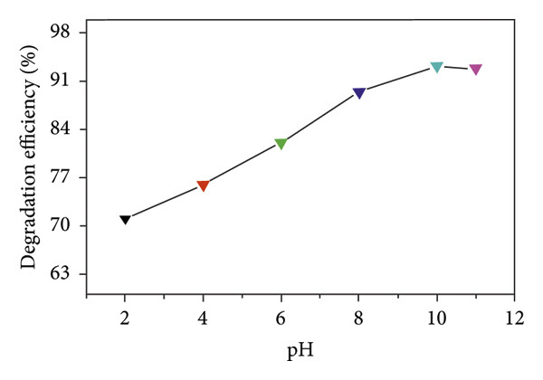 As different sources of wastewater possess different pH values, so pH has a straight influence on the surface charges of photocatalyst [39]. Effect of pH on degradation of RhB was studied in pH range 2–11 providing catalyst dose of 0.03 g in 40 mL of 10 ppm RhB solution for 30 minutes. Residual concentration of dye in the clear solution was determined with UV‐Vis spectrophotometer. Catalytic efficiency of CuNi/Bi2MoO6 increases with the increase in pH (Figure 9(b)). Rhodamine B, being a cationic dye, would likely to develop electrostatic forces of attraction with the catalyst at pH above isoelectric point of BMO and its degradation will be enhanced. Maximum degradation efficiency was found at pH 10, so it was selected as optimum pH for further studies.