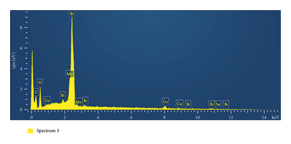 Figures 4(a) and 4(b) demonstrate the elemental composition study of pure BMO and codoped BMO particles from the EDX plot of respective SEM images. Bi2MoO6 is confirmed by high peaks of Bi, Mo, and O as base material. Moreover, EDX spectra also show that the loading of Cu (3%) and Ni (3%) is present in modified BMO.