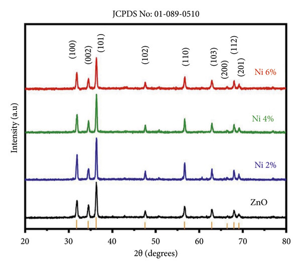 The pure zinc oxide and Zn0.98Ni0.02O, Zn0.96Ni0.04O, and Zn0.94Ni0.06O nickel‐doped samples were synthesized by the chemical wet coprecipitation method.