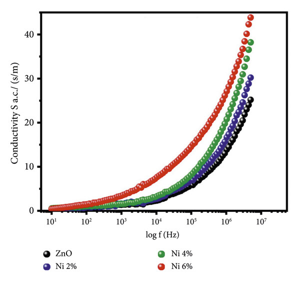 Figure 9 depicts the electrical conductivity of undoped and nickel‐doped zinc oxide nanostructures as a function of frequency for an alternating current. It is often believed, and supported by research [44], that AC electrical conductivity increases as frequency increases. The electrical conductivity of all the samples is almost nil at very low frequencies, rising steadily with increasing frequencies and then dramatically increasing at extremely high frequencies. The Maxwell–Wagner interfacial model can explain this frequency‐dependent conductivity performance. The charge carriers are met with resistance at the grain boundaries. These ions are free to move about inside the grains, but their resistive nature prevents them from leaving the grains. The little increase in conductivity at low frequencies can result from the tunneling or hopping effect, and charge carriers might be transported by an endless number of pathways between grains. In order to promote conductivity, a material needs a high frequency so that the charge transporters have enough energy to overcome the barriers, freeing the charges. When nickel is introduced into the Zn1−xNixO lattice, a significant number of charge transporters are generated, leading to an increase in conductivity. The AC conductivity of undoped and nickel‐doped zinc oxide is calculated using the following formula: