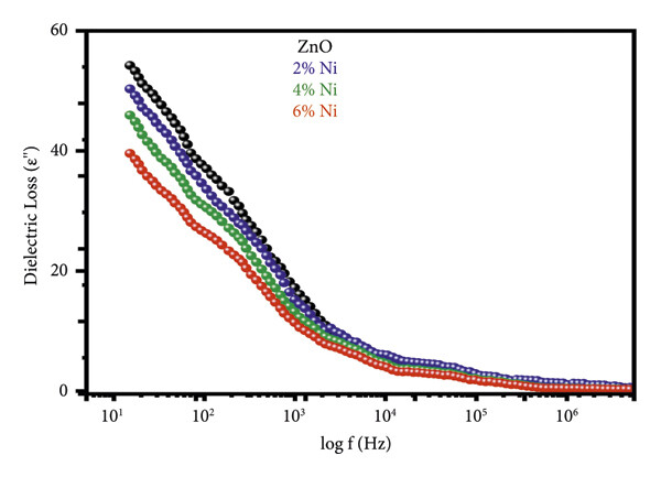 Figure 8 depicts the frequency‐dependent change in dielectric loss, ε ″, for both undoped and nickel‐doped zinc oxide (nickel = 0.02, 0.04, and 0.06) nanostructures. Figure 8 gives the impression that ε ″ decreases with increasing frequencies. Each sample exhibits scattering at low frequencies and frequency‐independent behavior at high ones. Increasing frequencies may have resulted in less dielectric loss due to SCP. It is assumed that the resonance of the domain wall is responsible for inducing the dielectric loss and for forcing the polarization to rotate. For all samples, it is found that dielectric losses are minimal at higher frequencies, which may be because the domain wall’s motion is impeded. The weakening of ε ″ at higher frequencies may also be brought on by the migration of ions within the sample. At low frequencies, it was also observed that increasing the nickel content of zinc oxide (nickel = 0.02, 0.04, and 0.06) decreased dielectric loss and increased the dielectric constant. Nickel‐doped zinc oxide’s constant dielectric loss at high frequencies and low dielectric loss at lower frequencies make it a useful material for high‐frequency device fabrication. Ionic hopping may account for the dielectric losses at low and intermediate frequencies, while ionic migrations may account for the conduction losses.