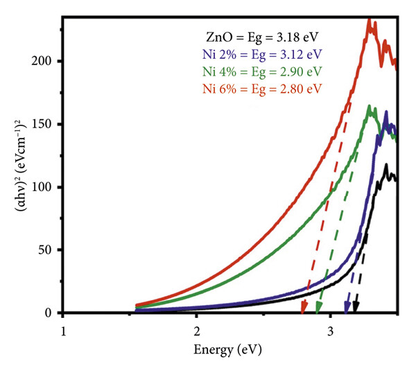 The UV‐Vis absorption spectra of undoped and nickel‐doped zinc oxide were carried out through UV‐Vis spectrometer in the 300–800 nm wavelength range as given in Figure 5(a). Generally, the position of absorbance value depends on the size of the nanoparticles, oxygen deficiency, grain structure, band gap, etc. The absorption band edge in undoped zinc oxide occurs at 367 nm and that in nickel‐doped zinc oxide occurs at 369–375 nm which was slightly shifted towards longer wavelengths. This shows that the band gap has decreased with nickel doping. The peaks due to nickel doping are attributed to d‐d transition bonds [32], which is the property of nickel in octahedral symmetry. These electronic transitions confirm that Zn is substituted by nickel into the octahedral zinc oxide lattice. Tauc relation was used to calculate the optical energy band gap.where hν, α, and E g are the photon energy, absorption coefficient, and band energy, respectively, and n corresponds to the type of transition. The band gap was calculated by plotting (αhν)2 versus hν and then the linear part of the absorption edge was extrapolated to find the intercept with energy axis as shown in Figure 5(b). The band gap calculated was 3.18 eV for undoped zinc oxide and 3.12 eV, 2.90 eV, and 2.80 eV for Zn0.98Ni0.02O, Zn0.96Ni0.04O, and Zn0.94Ni0.06O nickel‐doped zinc oxide, respectively. The d electron of nickel and the s and p electrons [32] of the host matrix are known to have a strong exchange contact, which may be responsible for the narrowing of the band gap through sp‐d exchange interactions [38]. The wurtzite structure of zinc oxide is unaffected by the presence of Ni+2 ions in the divalent valency state in an octahedral crystal field.