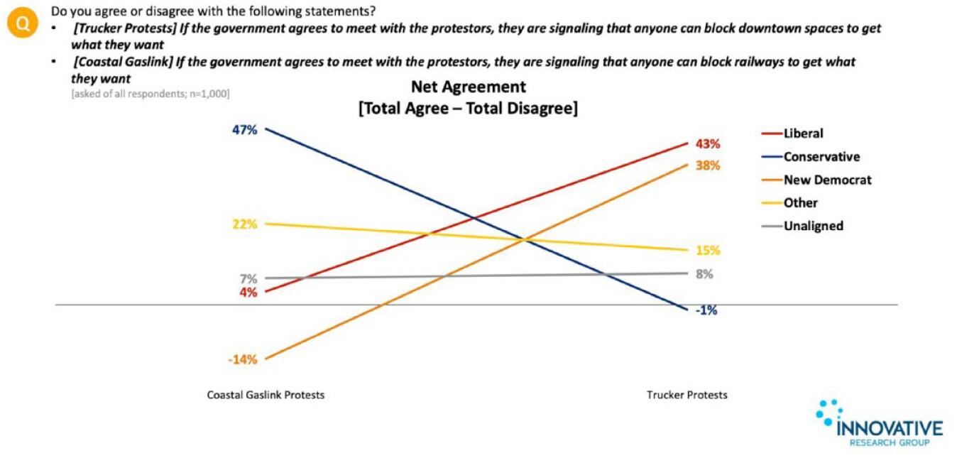 For a case in point, Innovative Research Group’s polling of both the 2020 Coastal GasLink pipeline protests in Northern British Columbia and the 2022 Freedom Convoy in Ottawa shows that support for this populist protest is highly correlated with partisan support (