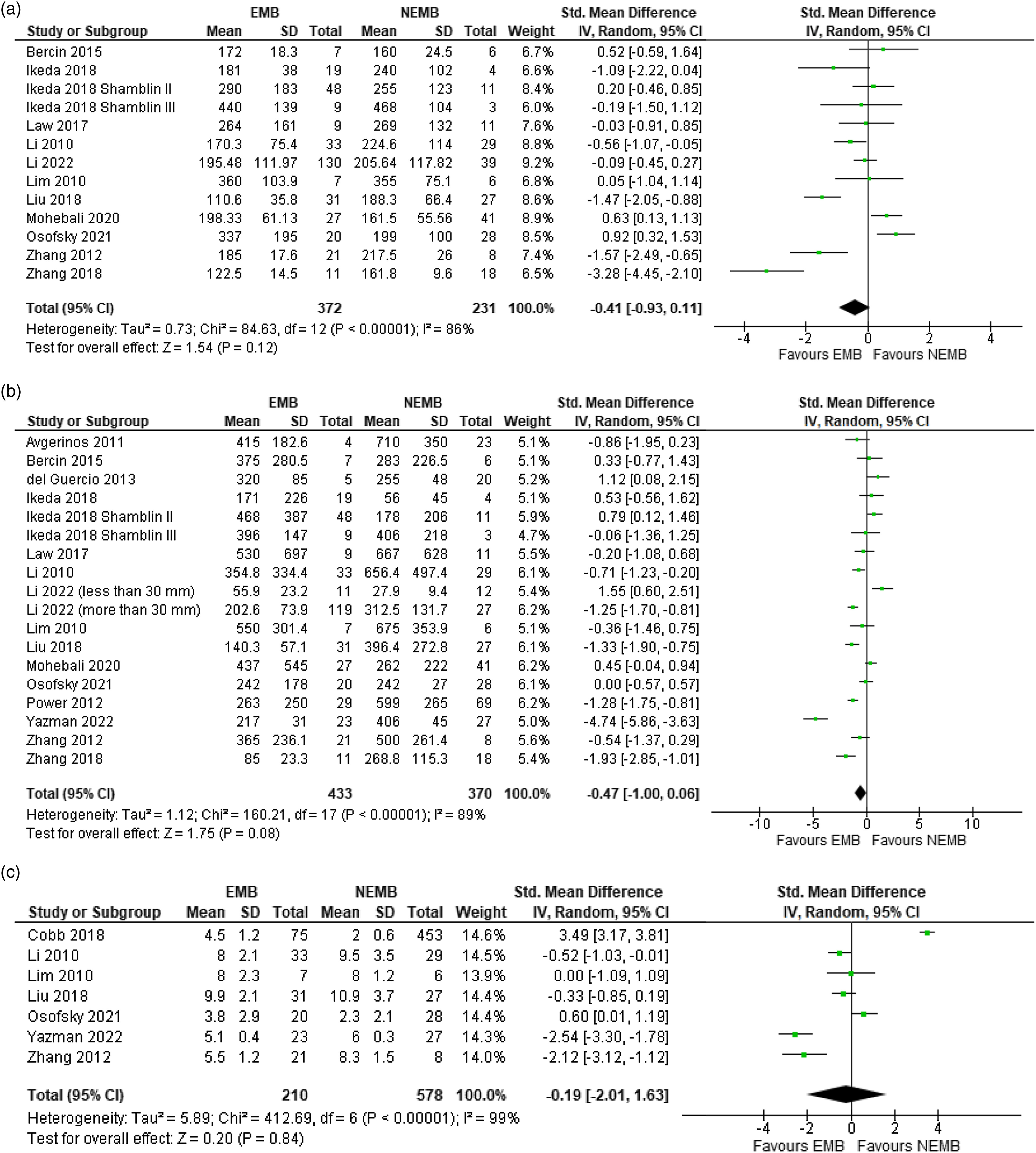 Figure 2. Forest plots comparing operative time (a), intraoperative blood loss (b), and post-operative hospital stay (c) in embolization (EMB) and non-embolization groups (NEMB). CI indicates confidence interval.