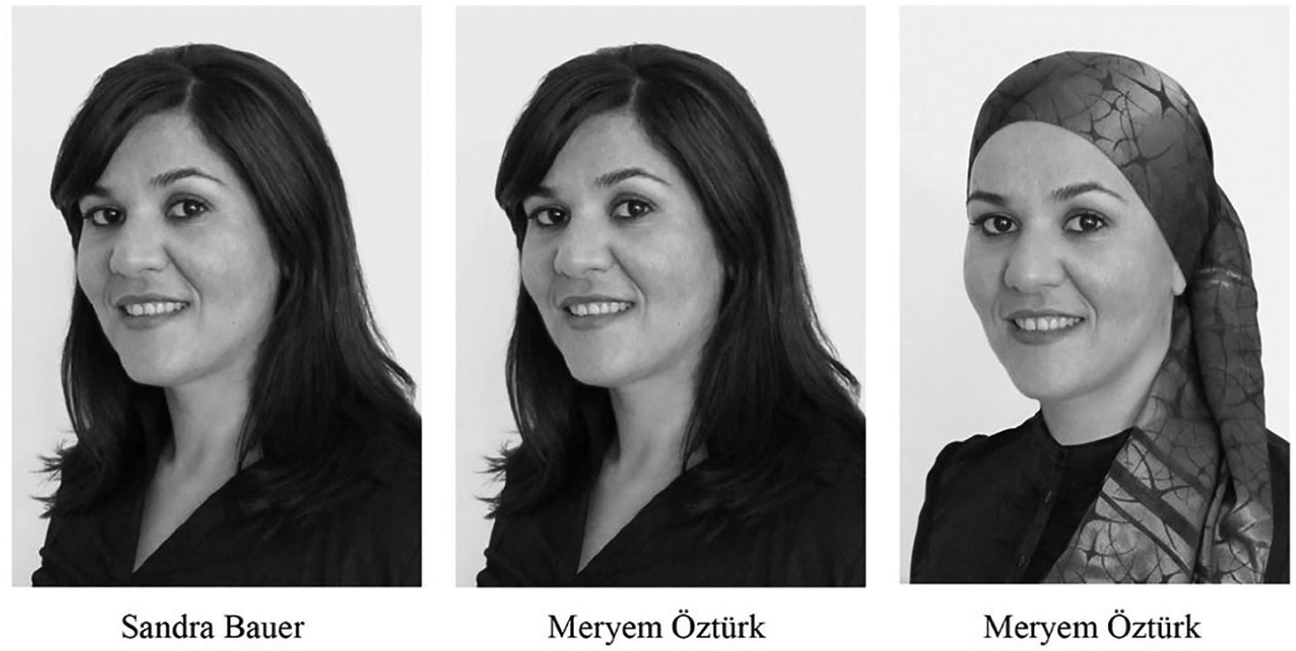 Figure 1: Sandra Bauer (bareheaded), Meryem Öztürk (bareheaded), and Meryem Öztürk with a headscarf.