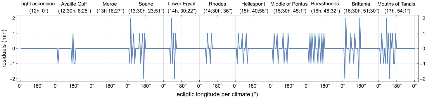 Figure 5 exhibits another salient feature of Gerard’s table and its preparation in manuscript form. Oblique ascension is symmetric around the equinoxes. In each climate, therefore, the residuals should be symmetric around 180° ecliptic longitude, which apparently is not the case. Also, the values for accumulated time-degrees are identical to the Arabic and Greek