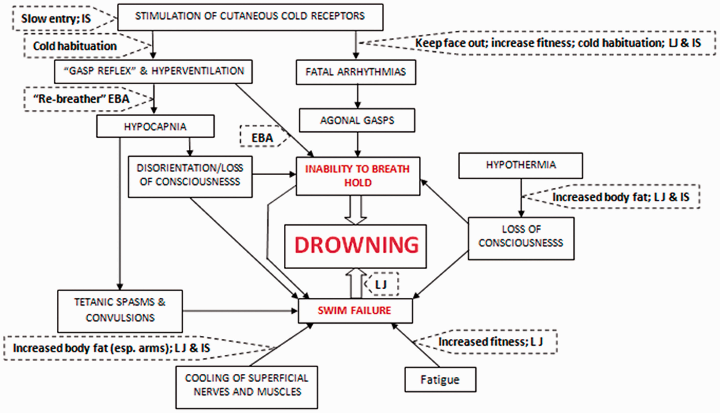 Figure 1). In this scenario, there is a clear progression towards swim failure in which swim stroke length shortens and stroke frequency increases. The individual becomes more upright in the water and ‘swimming’ becomes ‘treading water’, with periods of submersion and then submersion.