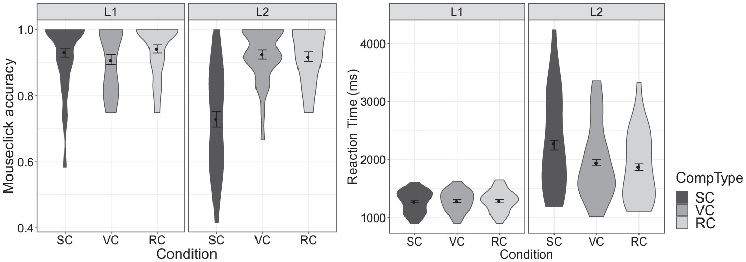 Figure 2 (left). While the L1 group showed similar accuracy rates across conditions, accuracy in the L2 group was substantially lower in the SC condition than in the other two. For statistical analysis, accuracy data were submitted to a generalized linear mixed effect model. This and all subsequent statistical analyses were conducted in R (version, 3.6.0,