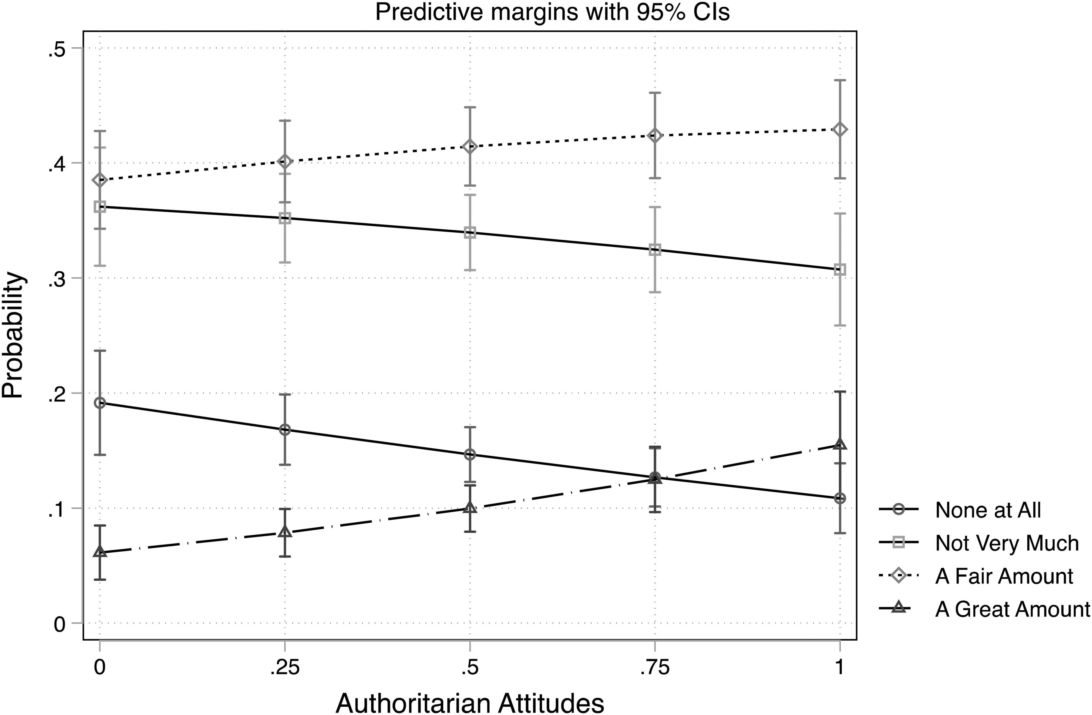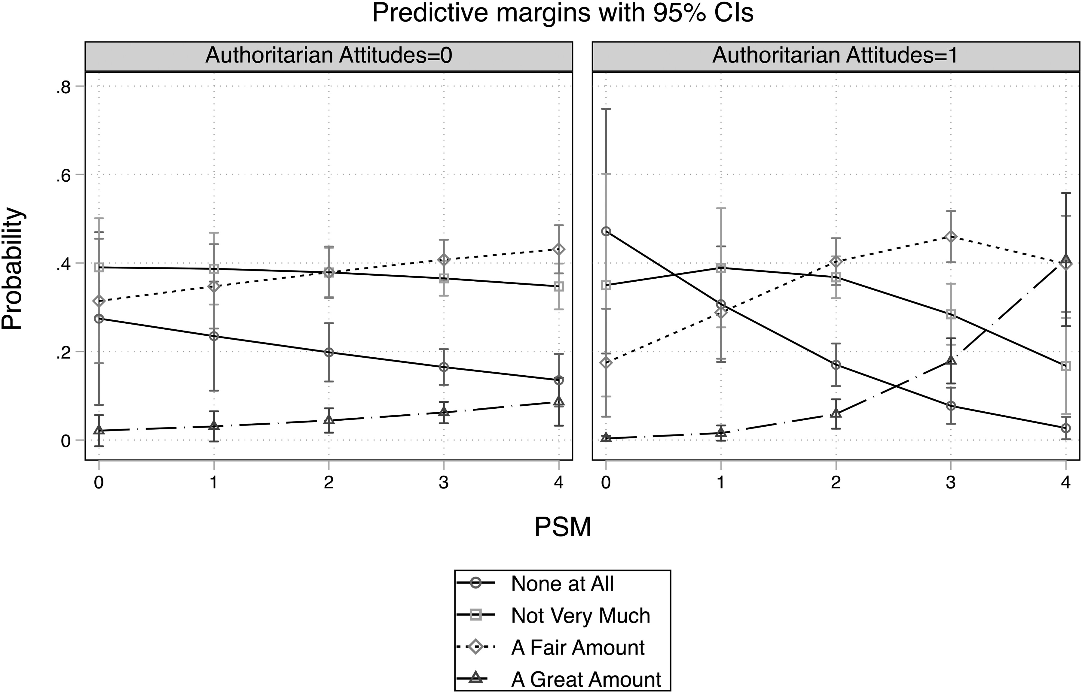 Figure 4 shows that the effect of PSM on the outcome of trust in government is largely dependent on authoritarian attitudes. Among low-authoritarians, PSM has a modest positive effect on support. Among high-authoritarians, PSM has a much stronger effect. Those high in both authoritarianism and PSM have a higher probability of reporting higher levels of trust in government, whereas those high in authoritarianism but low in PSM have a lower probability of reporting high levels of governmental trust. This interaction implies that PSM is especially powerful in shaping behavior among those with high authoritarian leanings.