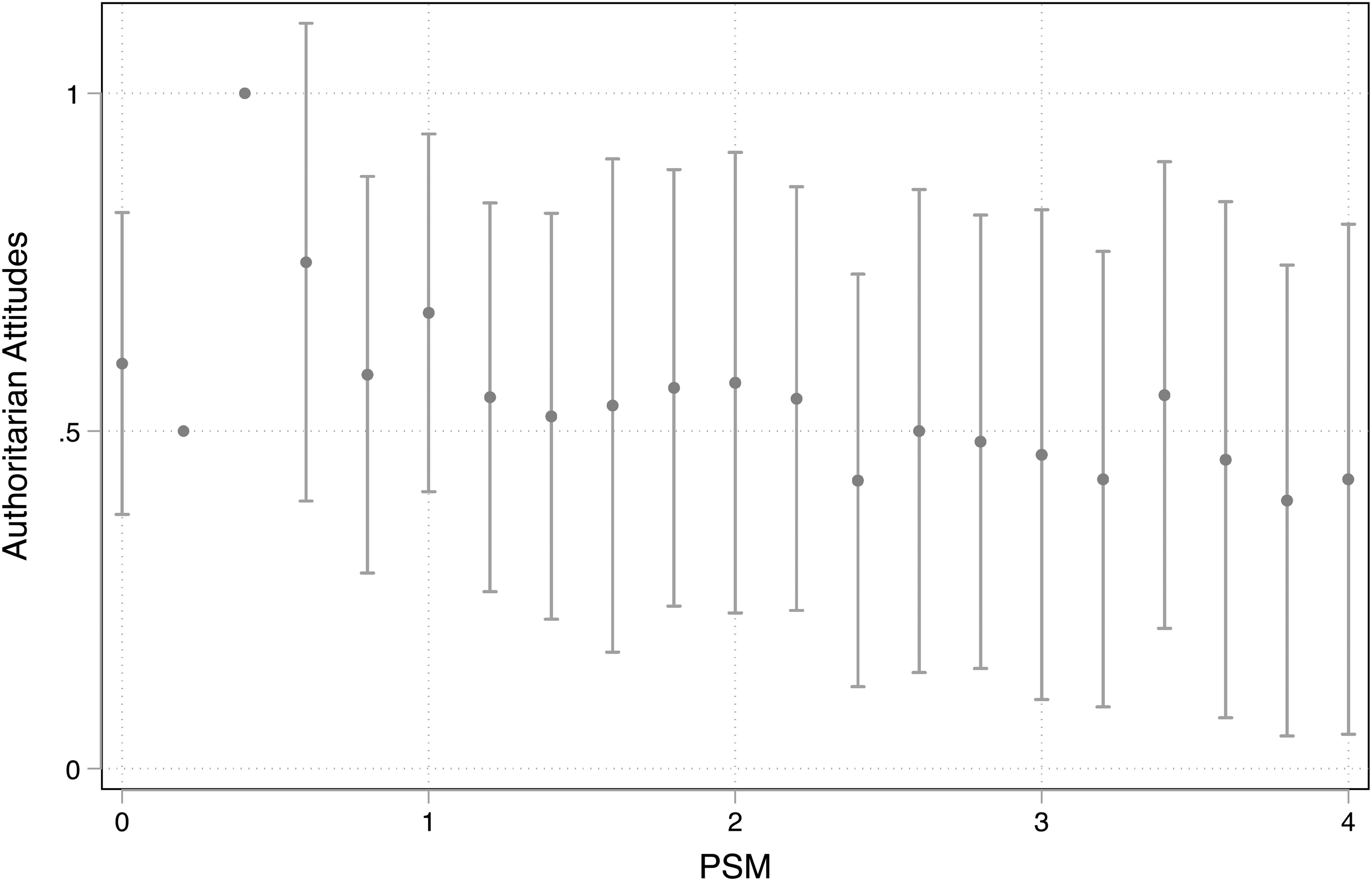 How are authoritarian attitudes measured? This measure is designed to capture a respondent's level of authoritarian emphasis on order and control, conformity, and obedience. Using discrete binary choice questions asking respondents to identify which value in the following pairings is more desirable: “respect for elders” versus “independence,” “obedience” versus “self-reliance,” “curiosity” versus “good manners,” and “being considerate” versus “being well-behaved.” The authoritarian response in each pair is scored as one, and the nonauthoritarian response is zero. We combine the four items additively and take the mean for each respondent. As a result, this measure of authoritarian attitudes is unlikely to be conflated with social conservatism or other related concepts like political ideology and is easily distinguished from the dependent variables (M.