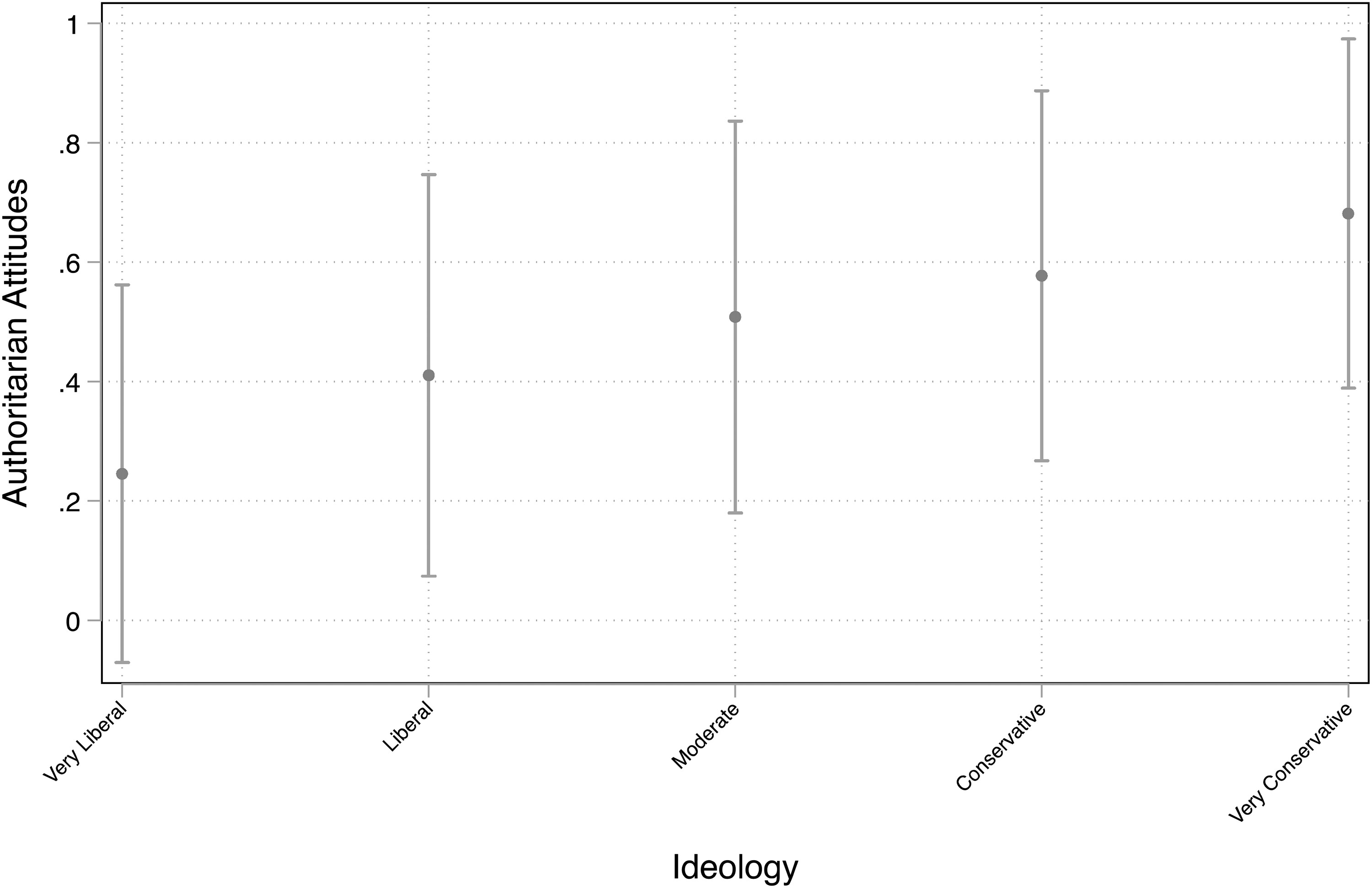 Figure 1, a t-test reveals that the difference between the aggregate authoritarian attitudes of those who self-report as very liberal and those who are very conservative is statistically significant at the p < .001 level. In