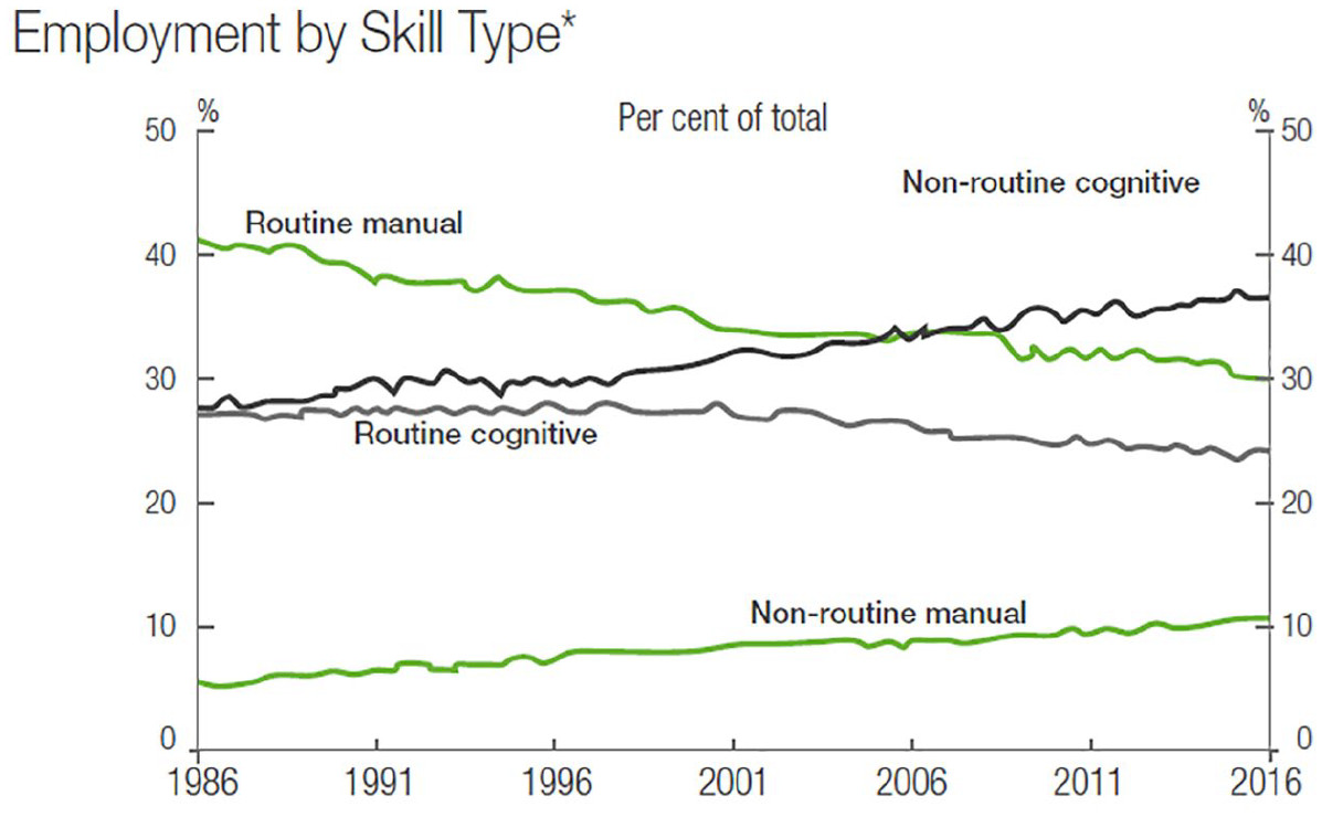 Figure 2 displays the changes in employment by skill type in Australia since the mid-1980s, which clearly shows the decline in routine work and the increase in non-routine work, both cognitive and manual (