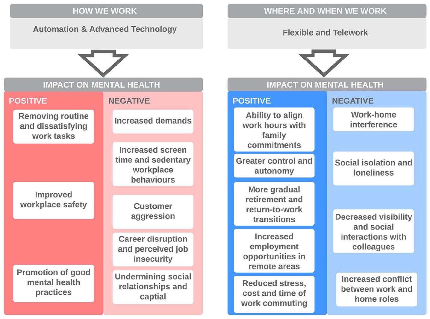 Overall, technology is negatively impacting mental health in the workplace in many ways by increasing demands, reducing resources and changing how employees view the future, which all have hidden and direct costs to employers and employees. Considerable research now highlights that work factors such as poor job design, high job demand, low job control and high effort–reward imbalances are associated with a greater risk of developing common mental health conditions (
