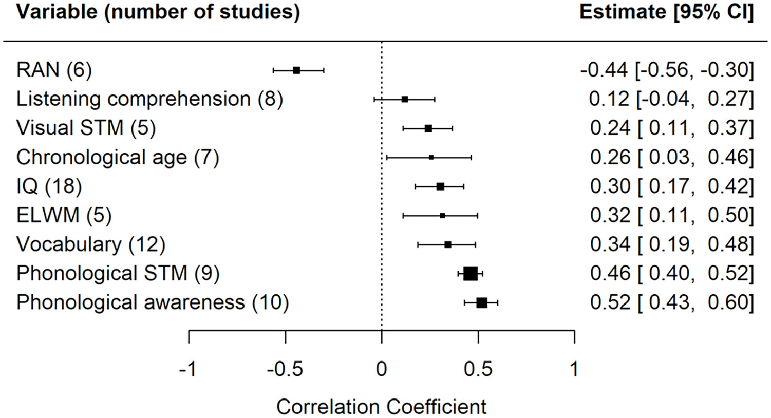The number of relevant variables varied across the primary studies. Hence, some of the coded correlations were reported in many of the primary studies, whereas some correlations only occurred in one or two primary studies. To minimize the risk of bias where the result is driven by a few primary studies, we decided to only analyze correlations between variables that were reported in five or more studies. As a result, our meta-analysis included correlations between decoding and these variables: phonological awareness, listening comprehension, vocabulary, phonological STM, visual STM, ELWM, RAN, IQ, and chronological age and between reading comprehension and these variables: decoding, listening comprehension, vocabulary, and IQ.
