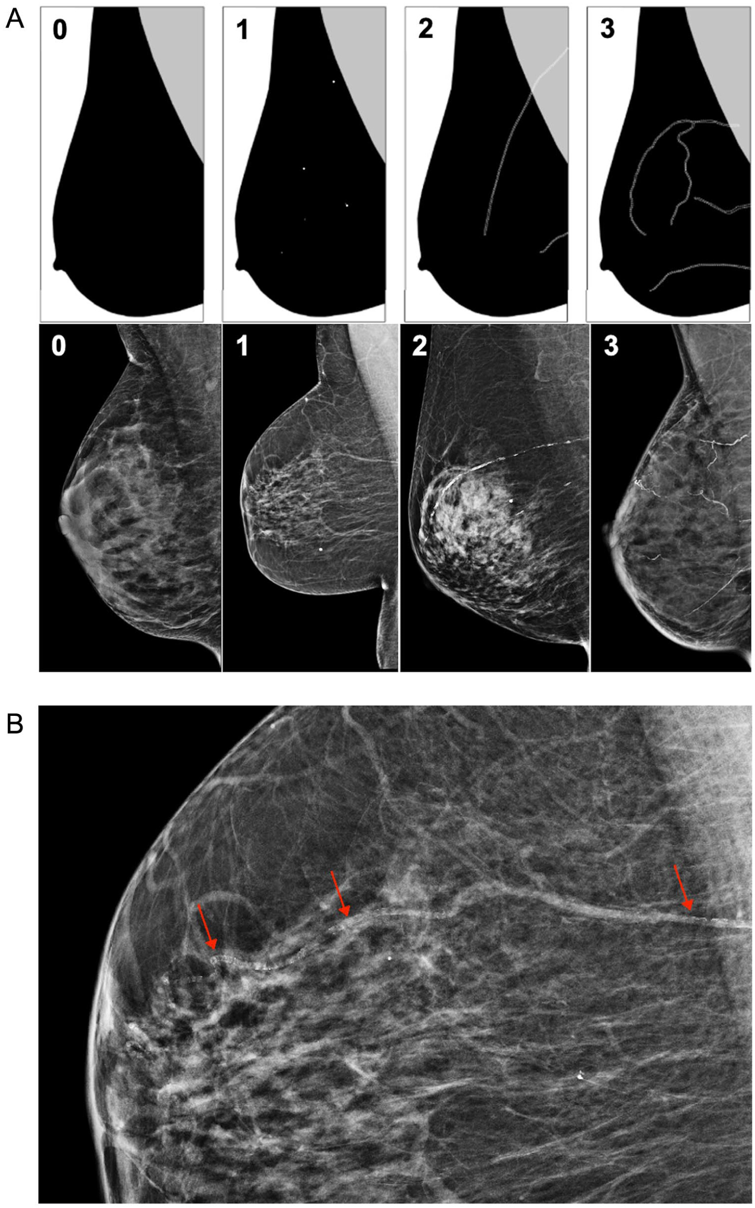 The detection and quantification of BAC on mammography can be performed subjectively by the interpreting radiologist. Depending on their severity, BAC may appear as coarse, tram-track, or tubular calcifications on mammography (