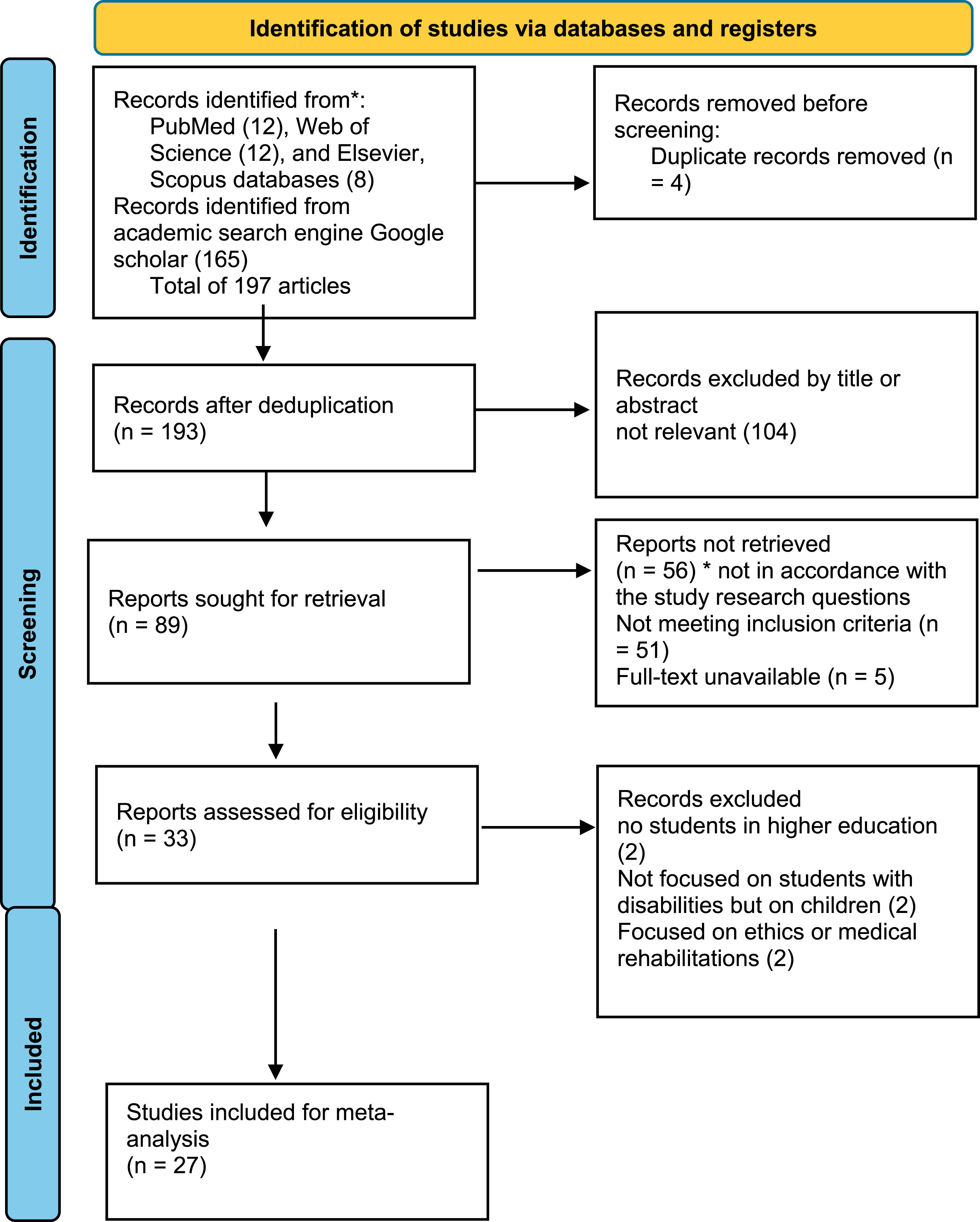 (“AI-powered assistive technology” OR “artificial intelligence”) AND (“disability” OR “students with disabilities” OR “special needs”) AND (“higher education” OR “university” OR “college”) AND (“accessibility” OR “academic accessibility” OR “inclusion”) AND (“academic performance” OR “learning outcomes” OR “student achievement”) AND (“inclusivity” OR “inclusive education” OR “inclusive learning”) AND (“learning tools” OR “adaptive learning tools” OR “assistive technology tools”) AND (“speech-to-text” OR “screen readers” OR “text-to-speech” OR “assistive devices”) AND (“adaptive learning systems” OR “personalized learning tools”).
