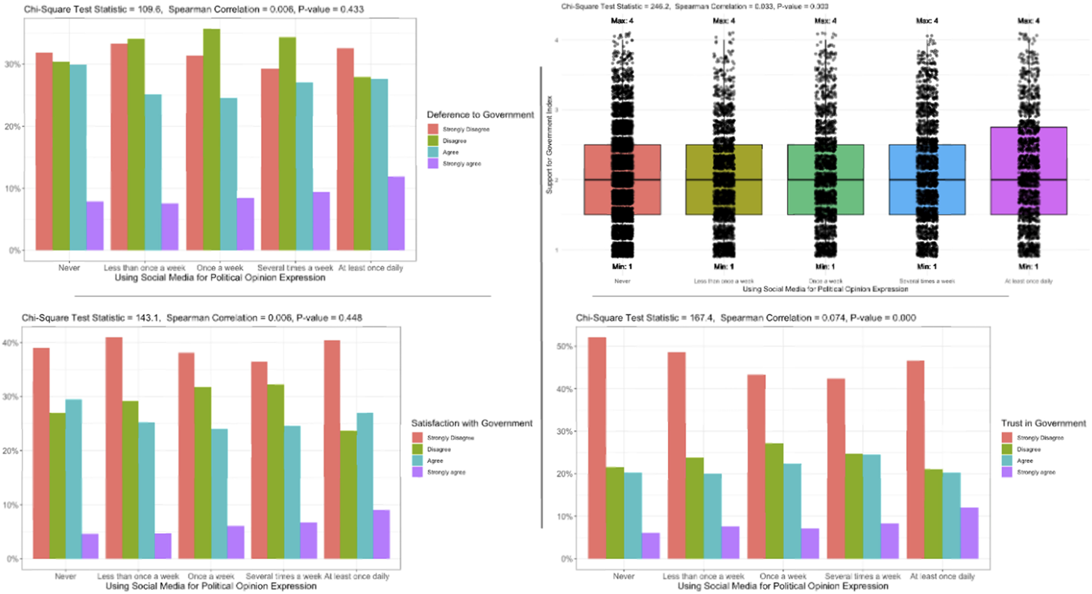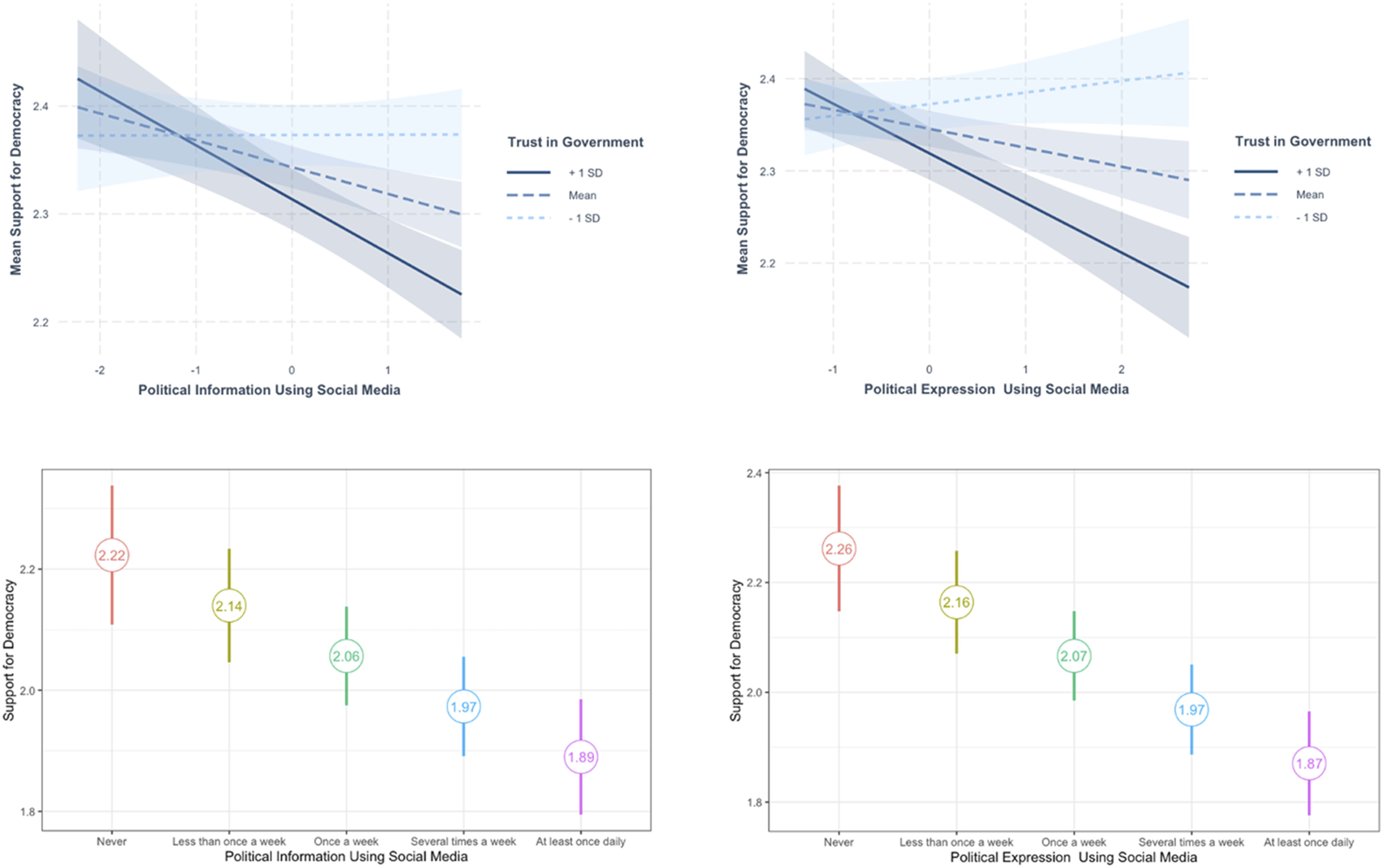 5 illustrate that individuals who frequently use social media for political information and expression are generally less supportive of democratic principles, suggesting a potential inclination towards social learning of authoritarian values via social media platforms. This negative correlation between the use of social media for political engagement and support for democracy becomes more pronounced when factoring in governmental attitudes, suggesting self-censorship. Additionally, we carried out additional analyses by sub-setting our data based on the values of four government-related moderating variables and presented the results in