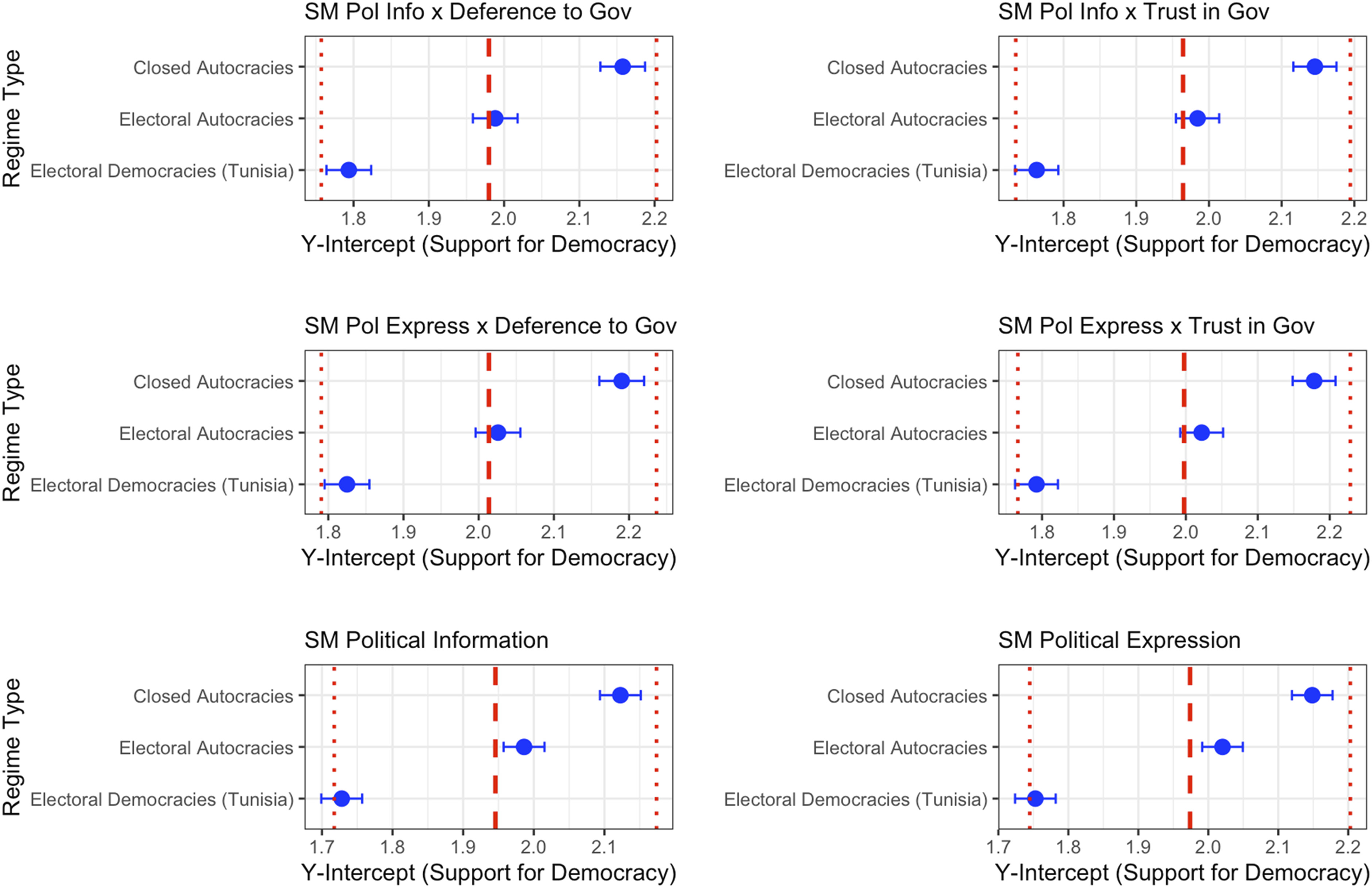 Figure 3 visualizes the Y-intercepts based on six models, four of them interaction (between online political engagement and deference to government and trust in government) models and two of them without interactions. While we included regimes of world variable as country-level variable (L2) in multilevel models, the categorical country name variable was not included as its inclusion prevented models from converging because of high collinearity. The red dashed lines show the fixed effects intercept, middle being average and the left and right being lower and upper bounds, respectively.