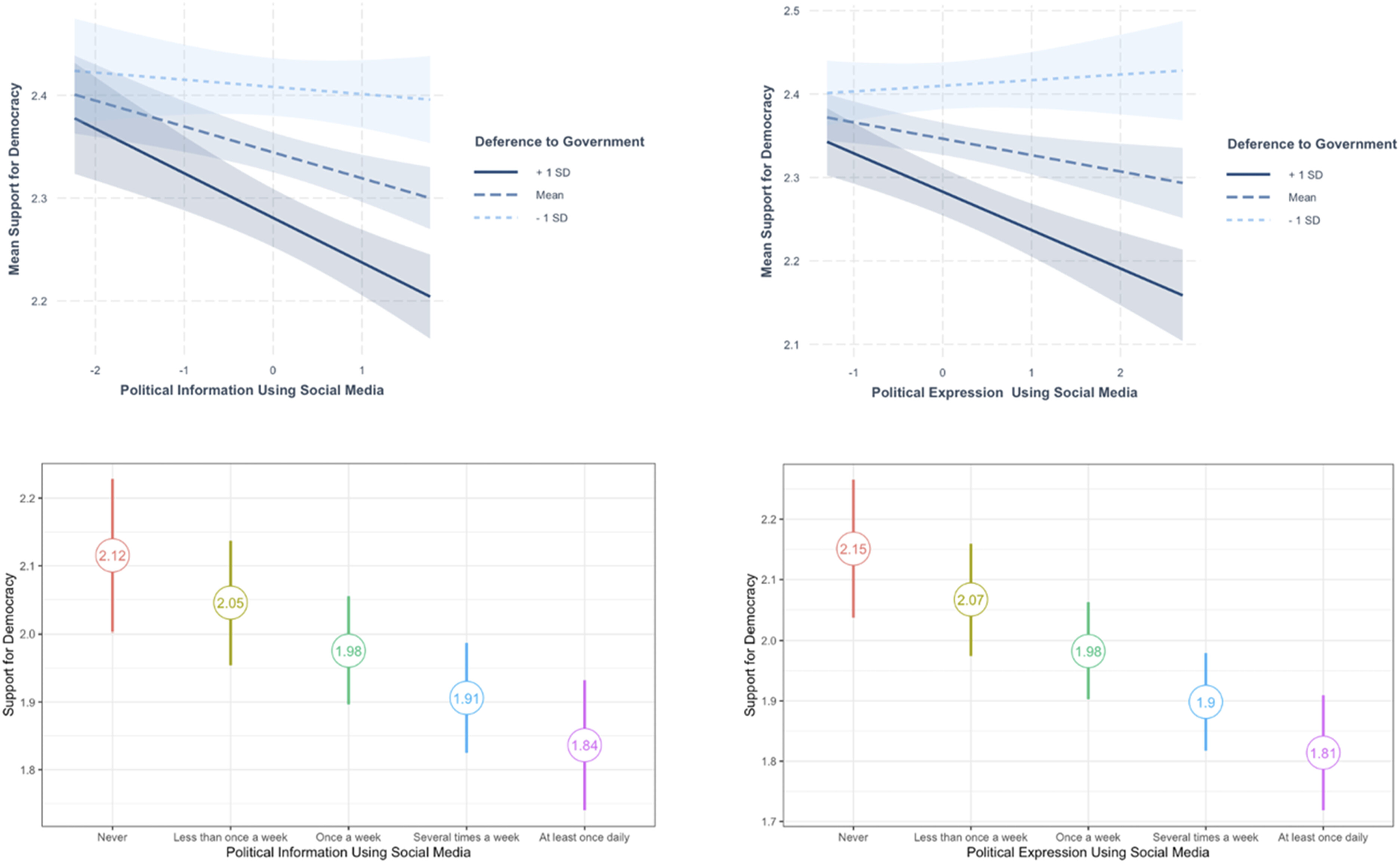 Next, we illustrate the mean predicted support for democracy at the lowest and highest levels of two key independent variables: social media-based political information and political expression, along with their interplay with four government-related variables—deference to government, trust in government, satisfaction with government, and support for government. All predictions are based on full models and are visualized with 95% confidence intervals in