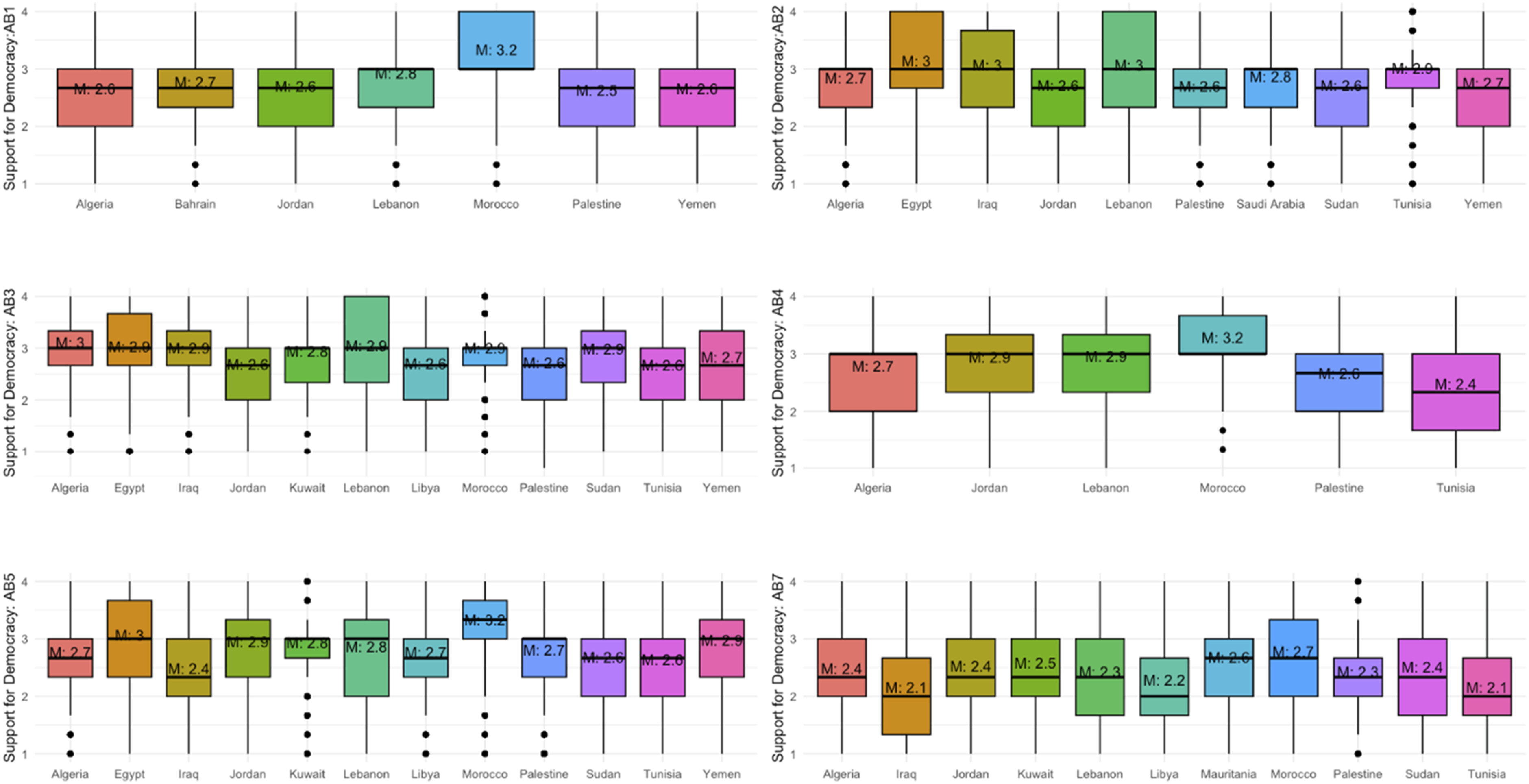 Given previous research showing that the impact of Internet use on political opinions is influenced by government filtering and institutional context, we also examine whether the relationship between political engagement on social media/internet and support for democracy varies by levels of democracy in Middle East. For instance,