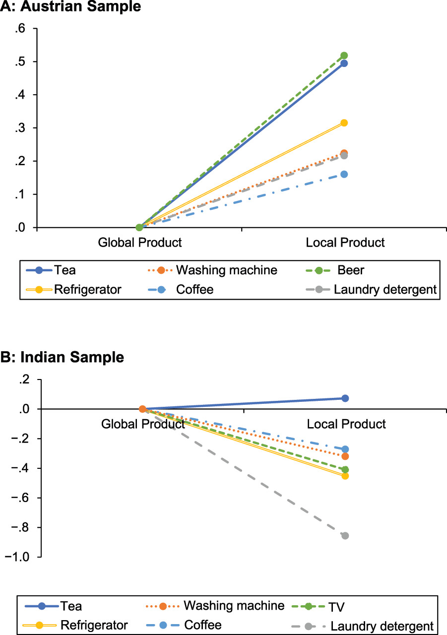 p = .00). This unexpected finding suggests that, within the tea product category, Indian consumers are willing to pay a price premium for a local over a global product that is lower than the price premium Austrian consumers are willing to pay. Effect sizes were again estimated using Cohen's d index, and all were very large (d = .74 or higher). Overall, our results offer strong support to H