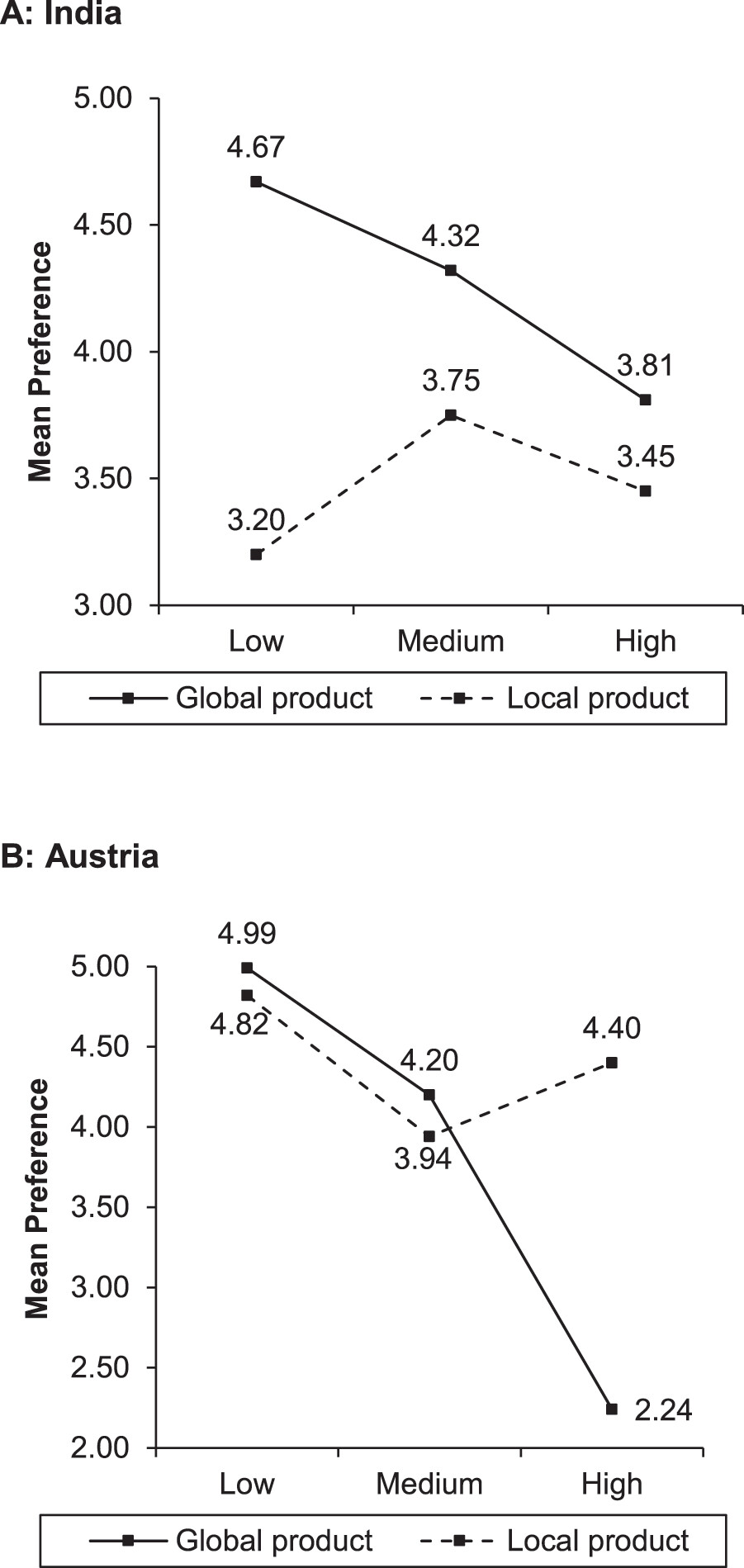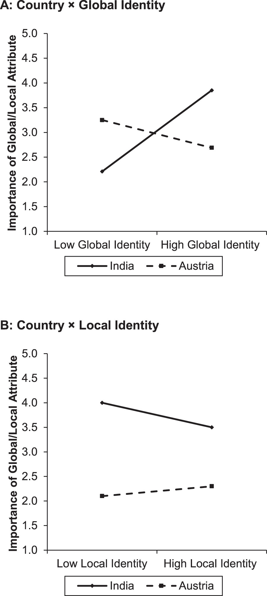 Figure 3 shows, the positive effect of global brand identity on the importance of the global/local product attribute found in India is reversed in Austria. Although a strong local identity in Austria slightly increases the importance of the global/local attribute, the relevant effect is not statistically significant. Thus, our results support H