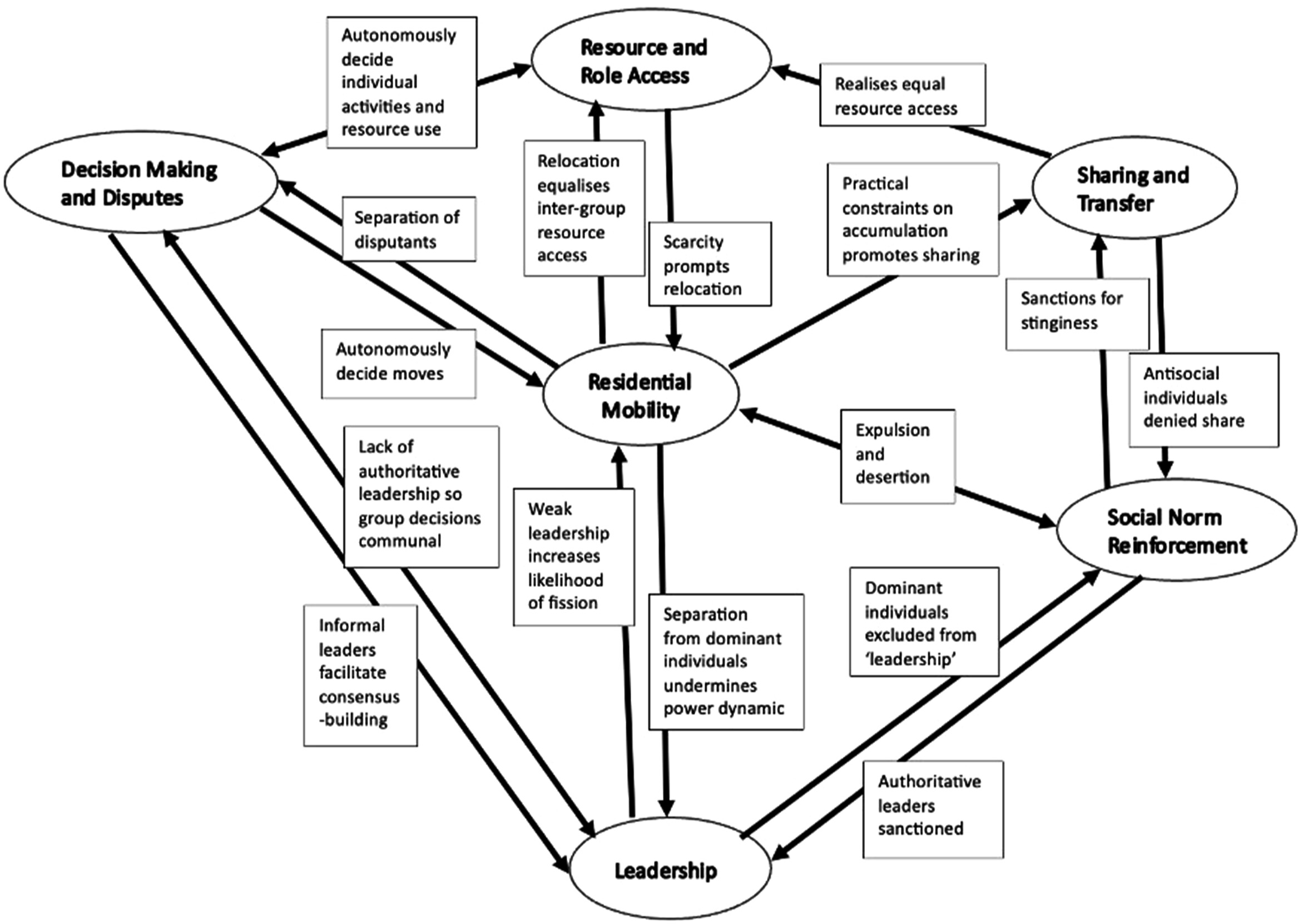 | Society | Residential mobility | Resource and role access | Sharing and transfer | Leadership | Decision making and disputes | Social norm reinforcement | N included paragraphs |