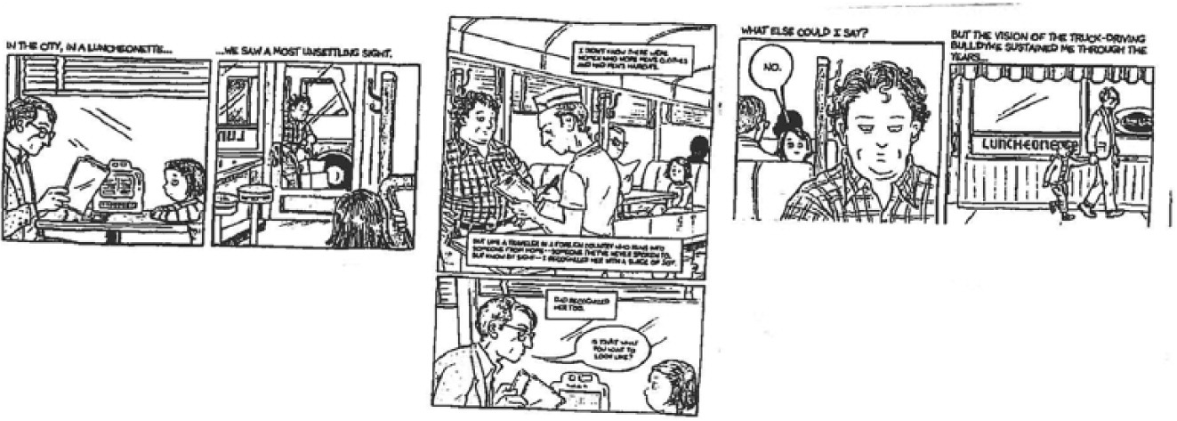 In the first two panels, we see Alison and her father, in profile, in a booth at a diner in Philadelphia, a city bigger than the town in which they live. Alison stares intensely into the distance, and her father studies the menu. The next panel offers Alison’s view: the doorway to the diner as a delivery is made. Bechdel recalls, “In the city, in a luncheonette . . . we saw a most unsettling sight.” The “unsettling sight” is the delivery person, a woman, dressed in jeans, plaid shirt, short hair, key ring on her belt loop—that is, a woman performing masculinity and thus disrupting normalized constructions of gender. In the third panel, Alison continues to study the delivery woman as, again, Bechdel recalls,
