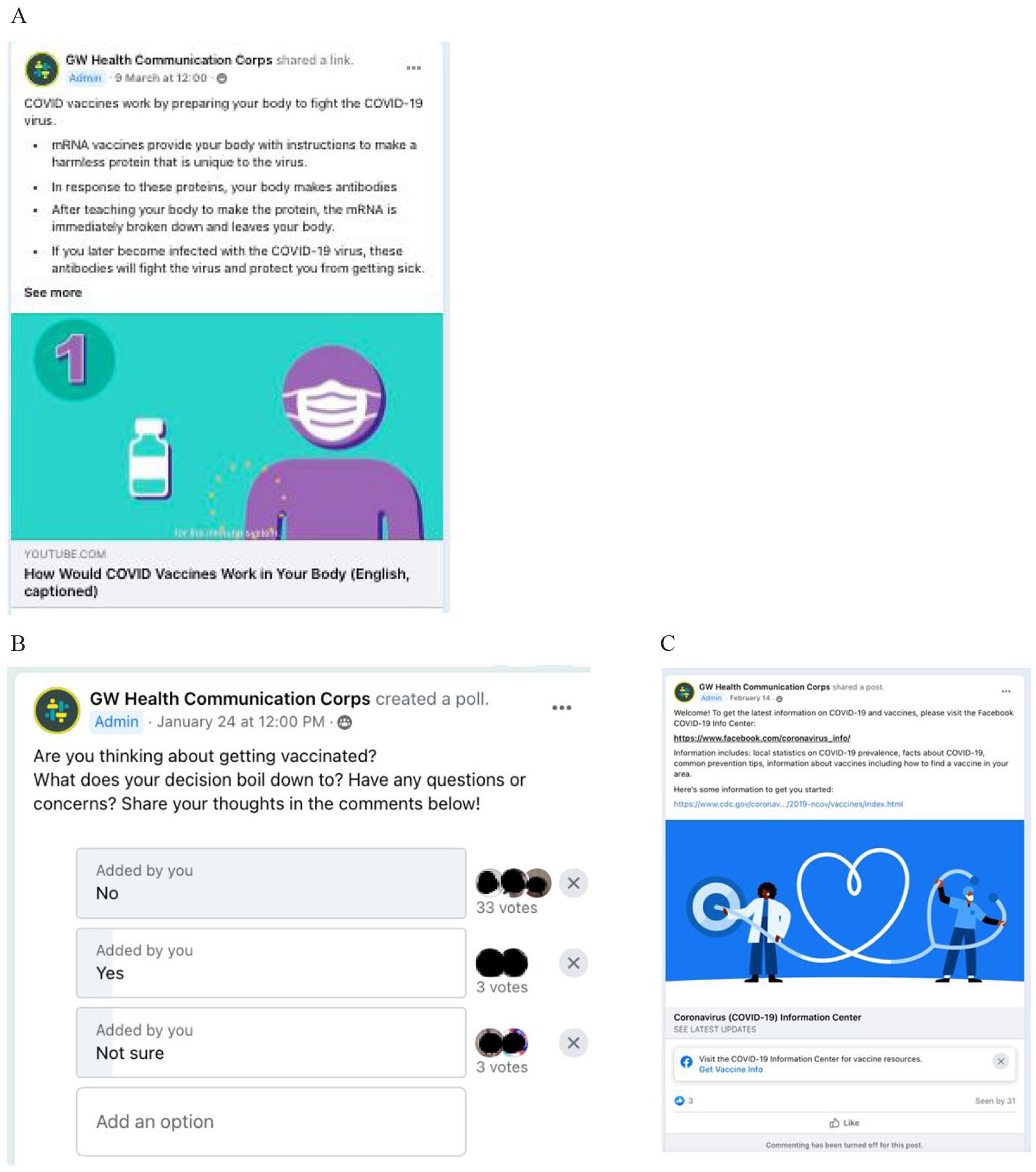 Participants in both groups received a link to a private Facebook group and referral to a Centers for Disease Control and Prevention (CDC) webpage on COVID-19 vaccination. All Facebook groups were titled similarly (e.g., “Conversations About Vaccines”), so that, participants could not tell if they were randomized to intervention or control. Once they joined, they were able to see the content in their assigned group.