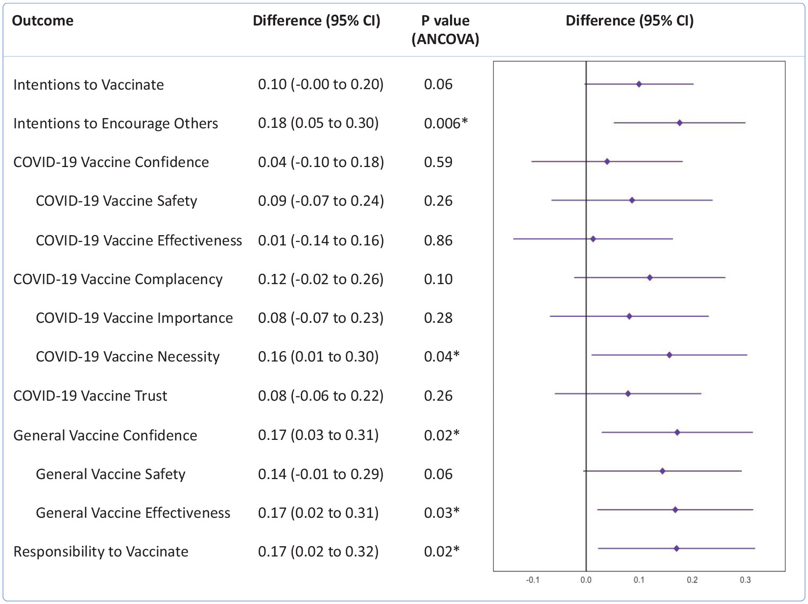 Small positive findings were found for some of the primary and secondary outcome variables. Improvements were found for beliefs related to the importance of encouraging others to get vaccinated, the need for COVID-19 vaccination, general vaccine confidence and the responsibility to vaccinate. Participants in the treatment group were also found to be more likely to improve in their intentions to vaccinate for COVID-19 (vs. stay the same or decline) than those in the control. However, despite these positive findings, changes in vaccination rates or intention to get vaccinated for COVID-19 during the 6-week study missed statistical significance at the p < .05 level. Also, other key vaccine-related beliefs, including COVID-19 intention to vaccinate, COVID-19 vaccine confidence (including safety and efficacy) and COVID-19 vaccine trust, showed no statistically significant intervention effects. These mixed findings indicate that this population may require additional efforts to have more positive changes in COVID-19 vaccine-related beliefs and intentions.