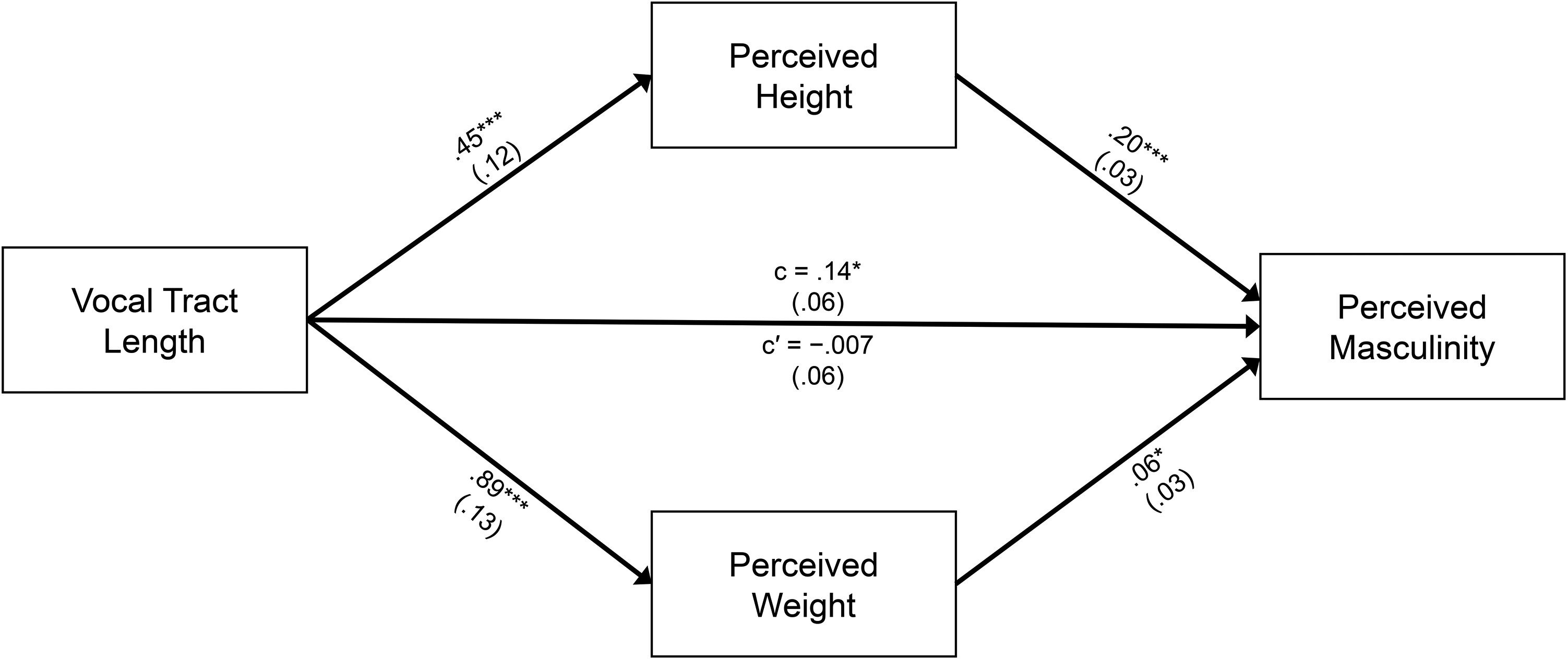 Hayes 2017]), entering VTL as the independent variable, perceived height and weight as the proximal mediators, perceived masculinity as the distal mediator, and voice–product congruency as the dependent variable.