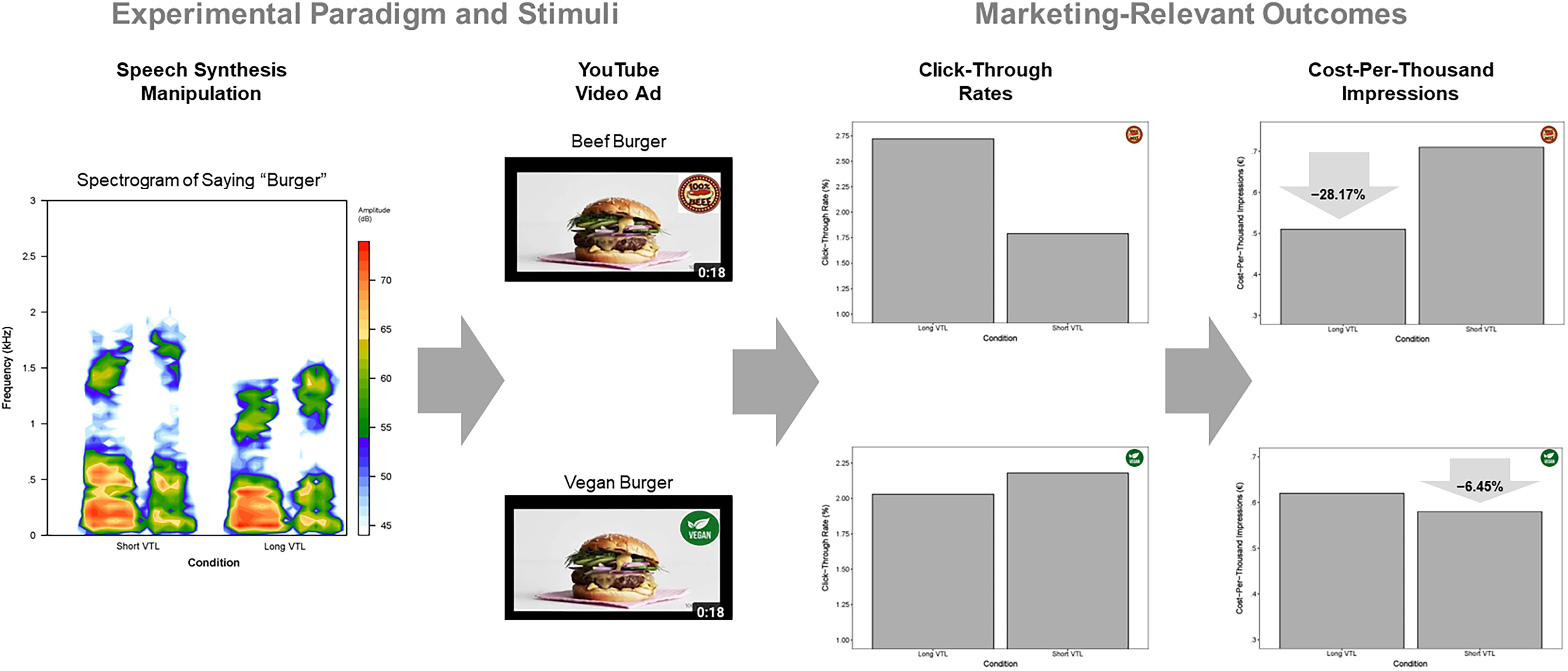The field experiment employed a 2 (VTL shifts: long [+20%] vs. short [−20%] VTL) × 2 (food products: masculine [beef burger] vs. feminine [vegan burger]) between-subjects design. We created four distinct ad campaigns that we ran simultaneously for three days on YouTube's advertising platform (Google Ads), targeting exclusively English-speaking users. We selected a skippable in-stream video ad with a cost-per-impression bidding strategy. A total of 35,430 consumers were exposed to the advertisement. The demographics across all campaigns were very similar: approximately 50% of the viewers were between 18–34 years old, 65% of viewers were male, and 35% of viewers were female.