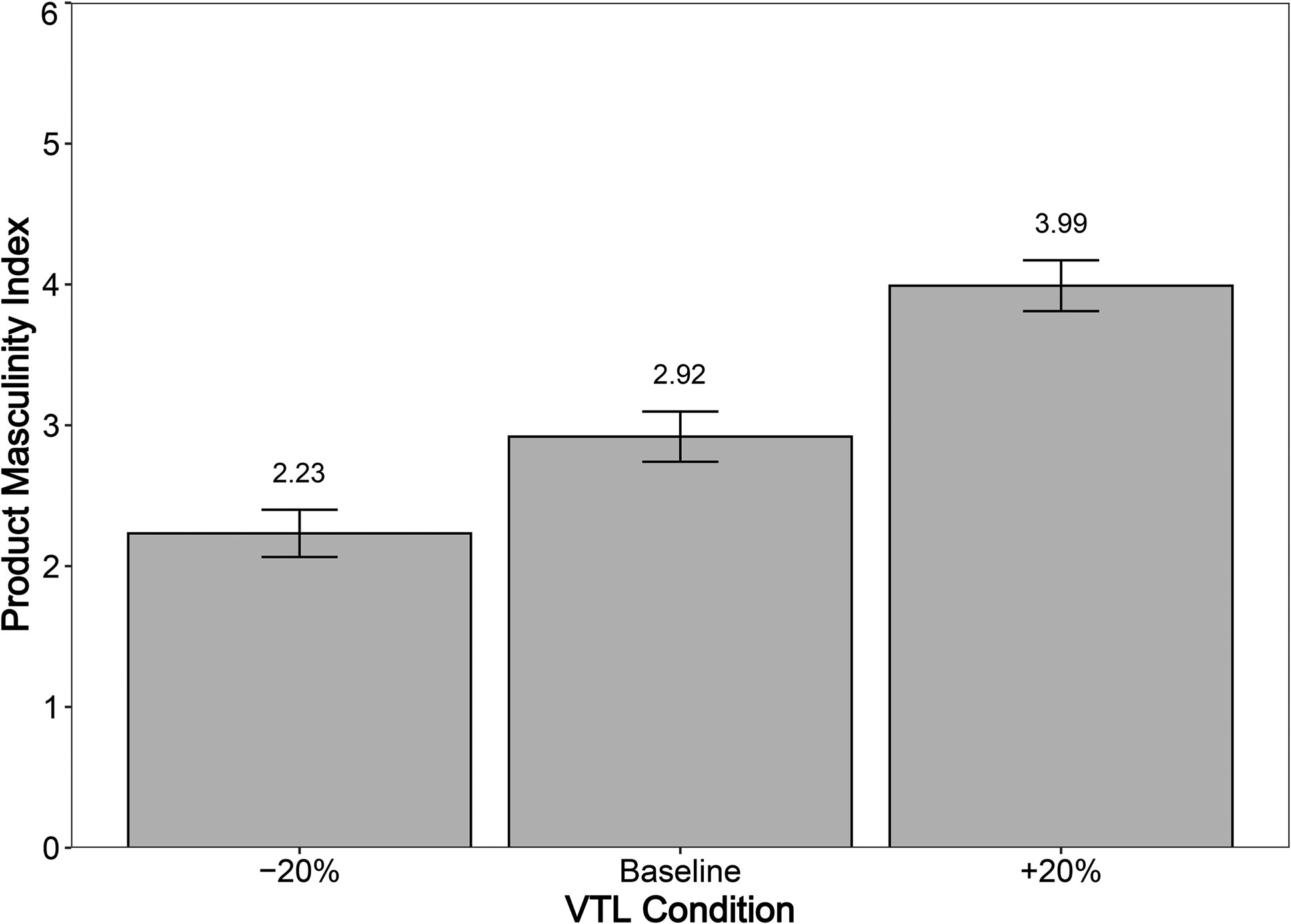 A one-way ANOVA revealed significant differences between the different vocal manipulations (F(5, 568) = 4.19, p < .001). Planned contrasts showed that increasing the vocal tract of the conversational agent led to enhanced perceptions of product masculinity compared with the baseline (MVTL = 6.05, SDVTL = .99; Mbaseline = 5.60, SDbaseline = 1.25; t(568) = 2.92, p < .01), pitch (Mpitch = 5.68, SDpitch = 1.04; t(568) = 2.48, p < .05), and loudness (Mloudness = 5.73, SDloudness = 1.05; t(568) = 2.16, p < .05). No differences in the perceived masculinity of the conversational agent were found between baseline, pitch, and loudness conditions (p > .05). As previously, the increase in the perceived masculinity of the conversational agent due to VTL manipulation does not appear to be further amplified when the pitch is decreased or the loudness is increased (p > .05).