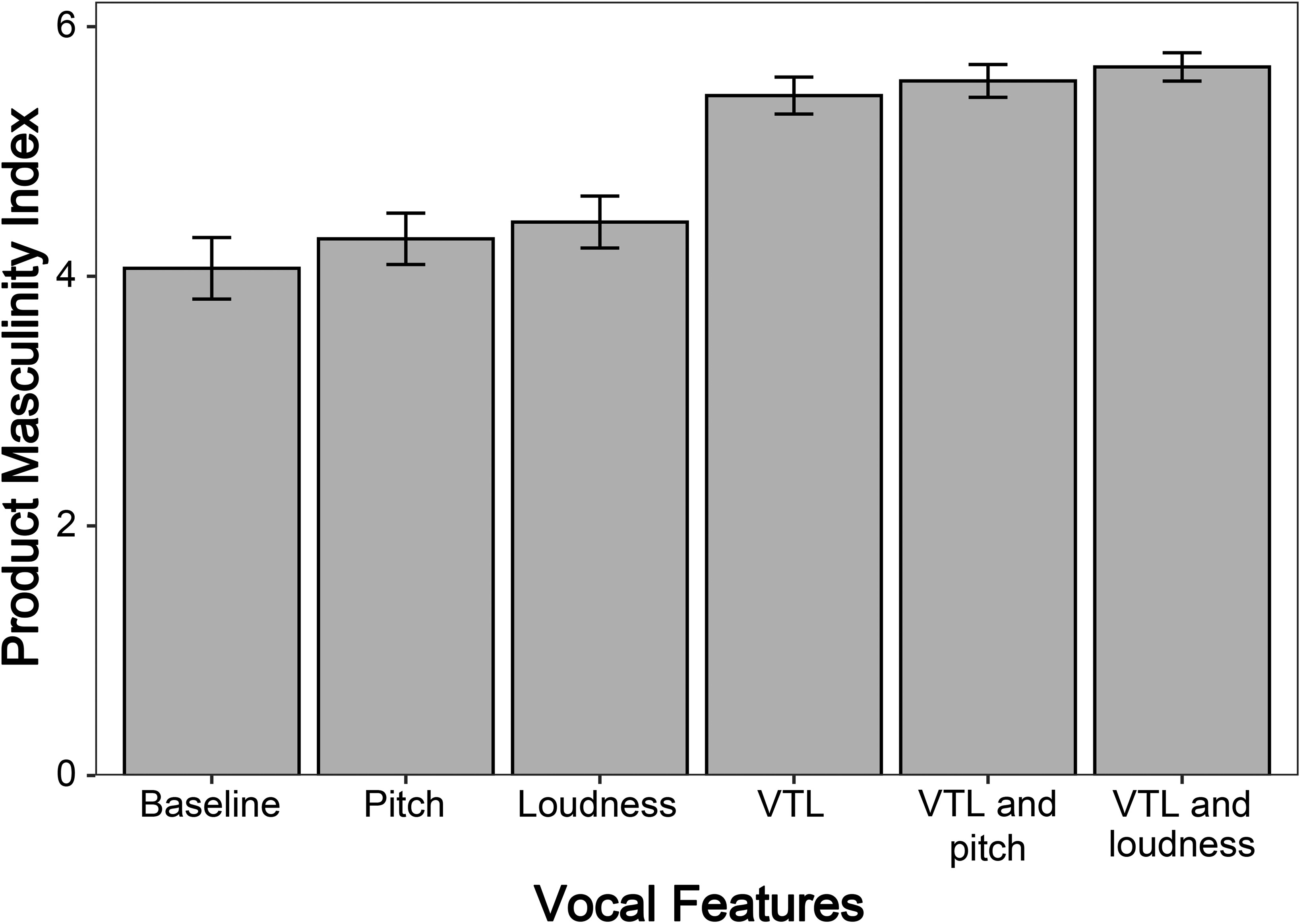 age = 38.77 years; 49% male, 51% female) who were randomly assigned to one of six conditions in a between-subjects design. These six conditions contrast an increased VTL against five key contrasts that could pose a threat to the current findings (i.e., that the current findings are merely a function of reducing the pitch of a speaker or speaking with enhanced loudness to promote masculinity attributions and in turn product congruency). It is also conceivable that VTL interacts with these related vocal features. We therefore randomly assigned participants to one of six vocal manipulations: (1) enhanced vocal tract (+20%), (2) decreased pitch (−20%), (3) increased loudness (+4 dB), (4) enhanced vocal tract (+20%) with decreased pitch (−20%), (5) enhanced vocal tract (+20%) with increased loudness (+4 dB), or (6) the default voice (baseline). The loudness enhancement was inspired by prior work on acoustics and the finding that a 4 dB increase represents a perceptually noticeable difference in terms of loudness (