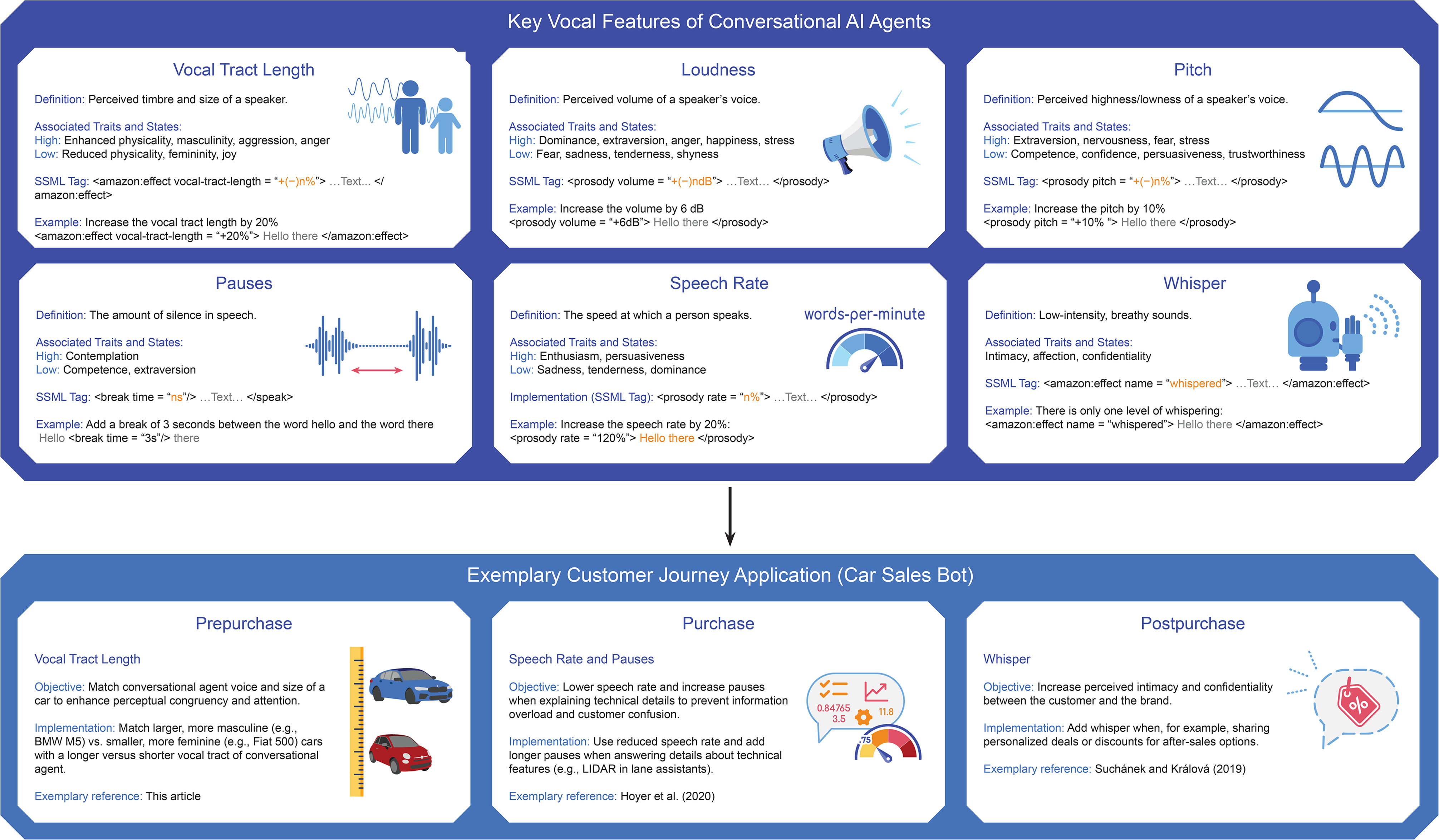 Figure 8 highlights some of the key vocal features in marketers' voice marketing toolbox (VTL, pitch, loudness, speech rate, pauses, and whisper) and how they can be combined to achieve a given marketing objective. For instance, at the beginning of a customer journey (prepurchase stage), firms may try to boost the match of their advertised product and the VTL of the conversational agent to leverage attention and ease of processing. As soon as consumers transition to the actual purchase phase, a greater range of technical and more implementation-oriented questions are discussed (