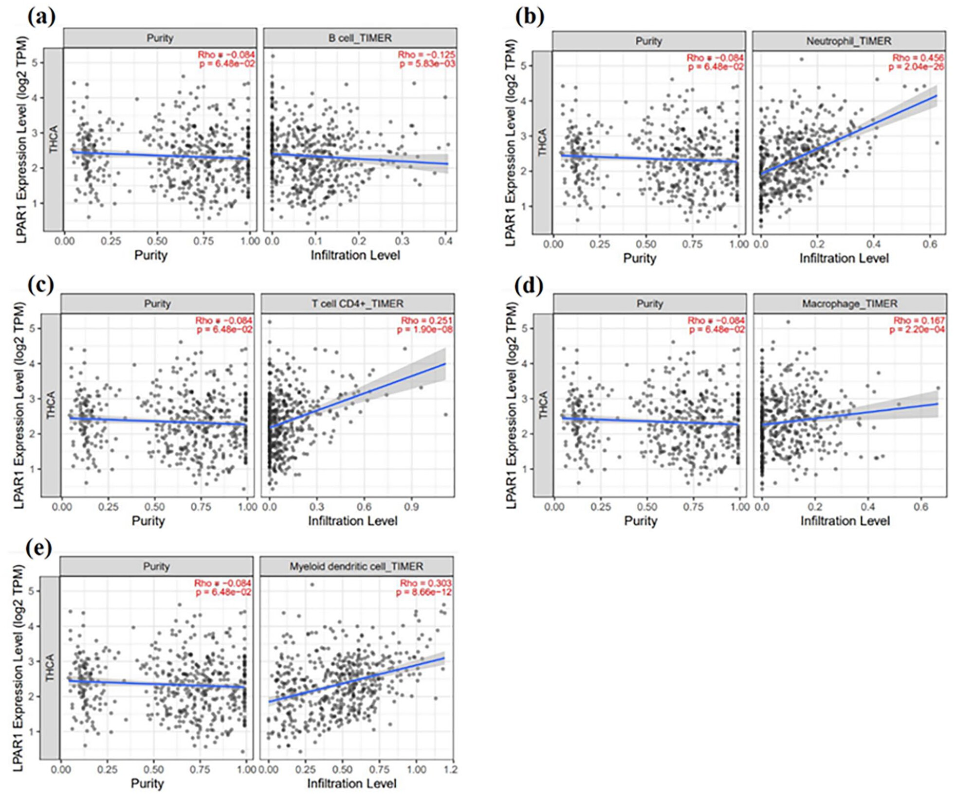 To investigate the potential correlation between LPAR1 expression and immune infiltrates in PTC, we utilized the Tumor Immune Estimation Resource (TIMER). This online tool leverages TCGA data to comprehensively analyze immune infiltrates across various cancer types. We computed the abundance of immune infiltrates, including CD8+ T cells, CD4+ T cells, dendritic cells, neutrophils, B cells, and macrophages, within PTC samples using partial deconvolution and linear least square regression. We aimed to establish a connection between LPAR1 expression levels and immune infiltrates in PTC samples. This was done by exploring potential associations between LPAR1 and the immune microenvironment in PTC.