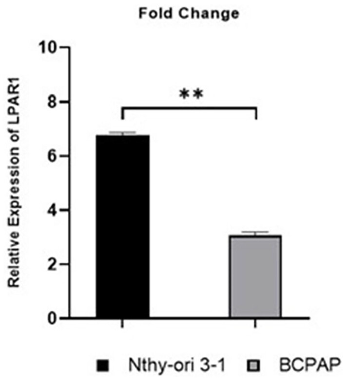 To investigate the potential involvement of LPAR1 in PTC, we examined the relative expression of LPAR1 in 2 cell lines. The results revealed that the average expression of LPAR1 was significantly decreased in the PTC cell line BCPAP compared to the normal thyroid cell line Nthy-ori 3–1 (P < .01, Figure 12). The data also indicated a noticeable trend wherein more advanced and metastatic stage cancers exhibited lower levels of LPAR1 expression.