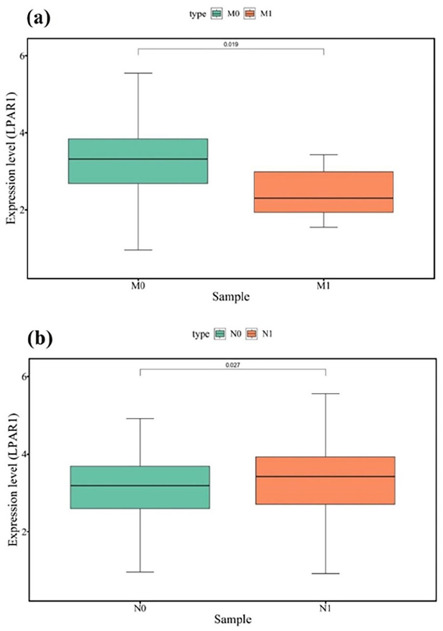 Our bioinformatics-based study underscores the importance of LPAR1 in the EMT of thyroid cancer. We observed downregulation of LPAR1 expression in PTC tissue compared to normal tissue. Our analyses have revealed a decrease in LPAR1 expression among PTC patients with distant metastasis compared to those without metastasis. Interestingly, despite the overall reduced expression levels of LPAR1 in PTC, we observed higher expression in patients with lymph node metastasis than those without lymph node involvement. This suggests that reduced LPAR1 levels can serve as a distinguishing factor, differentiating between PTC patients with lymph node metastasis and distant metastasis and distinguishing metastatic from non-metastatic patients (Figure 13).