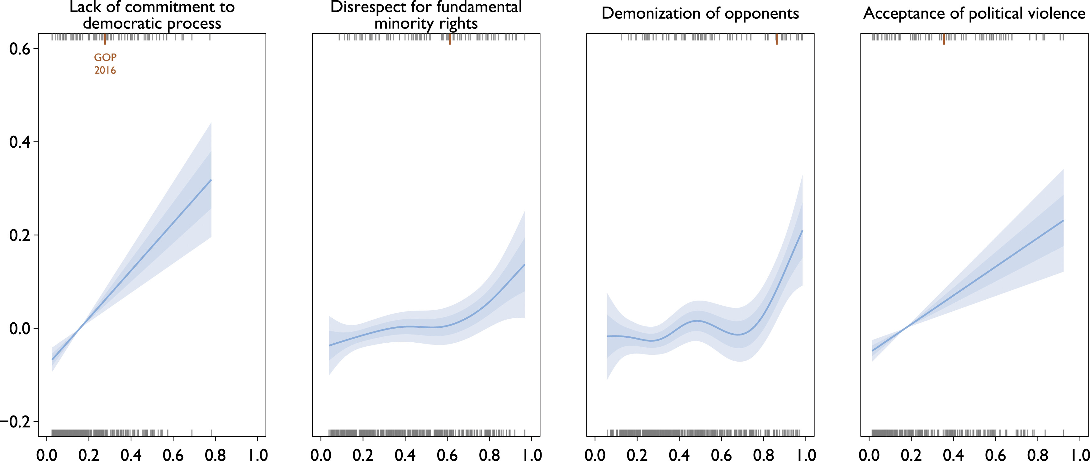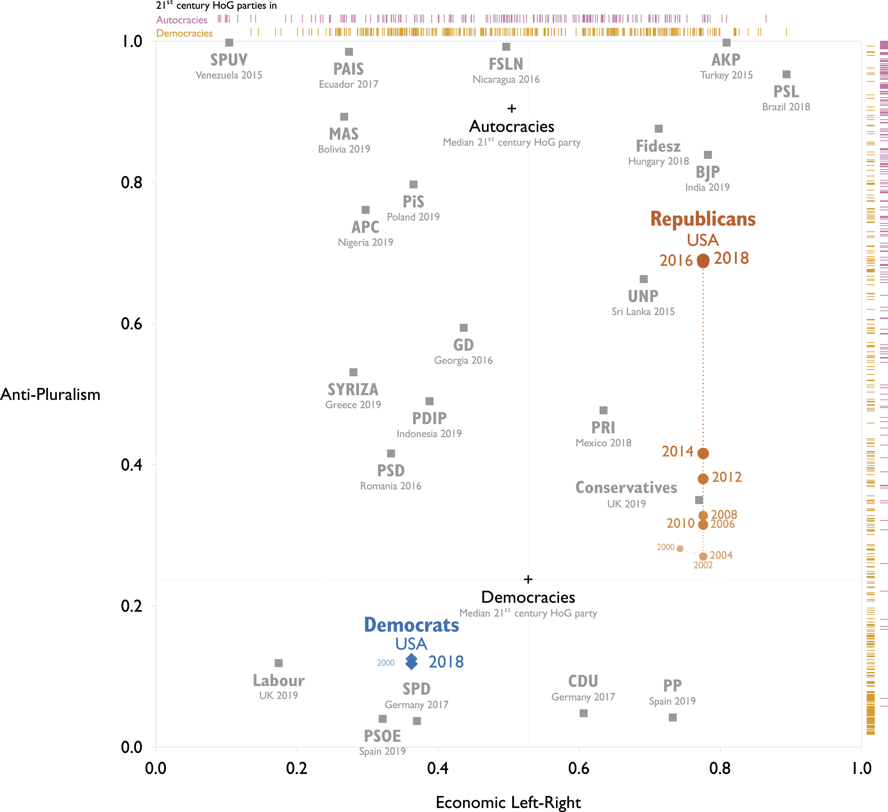 Already by 2016, the rhetoric of GOP’s leaders was closer to autocratic ruling parties such as the Turkish AKP (1.0) and Hungarian Fidesz (0.88) than to typical center-right governing parties in democracies such as the Conservatives in the UK (0.35) or CDU in Germany (0.05).