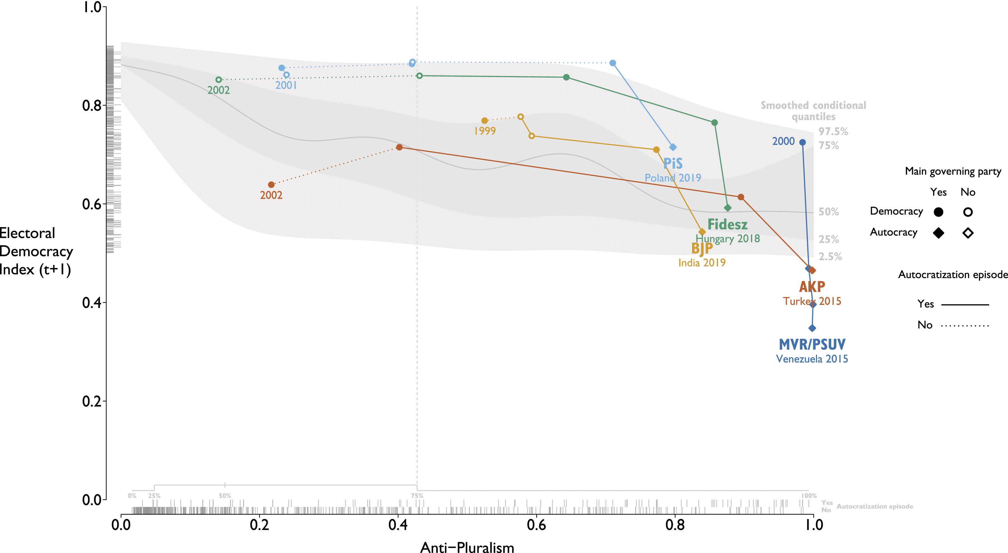 However, not all countries autocratize with anti-pluralists in office (