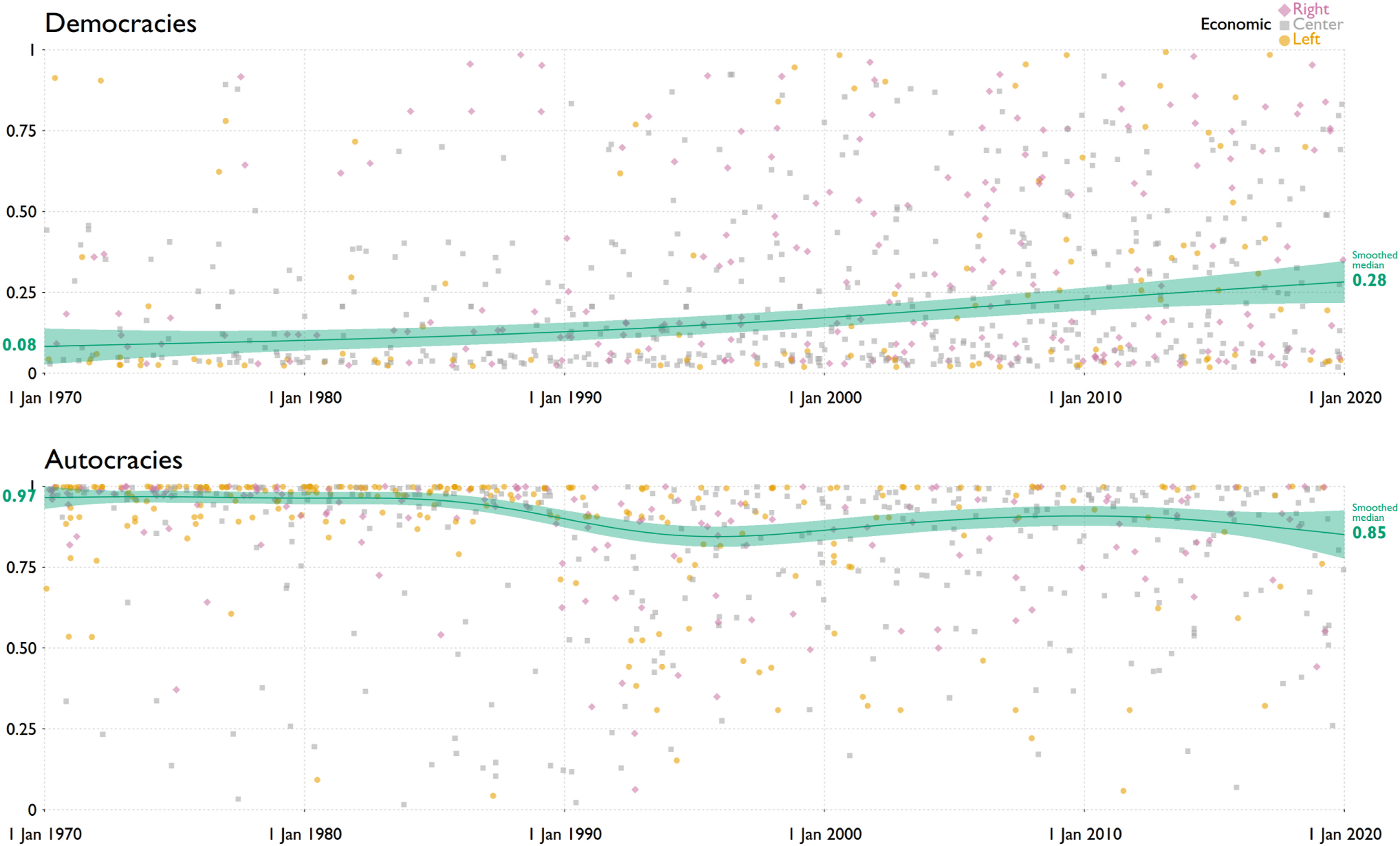 Figure 1) with the one in autocracies (bottom).