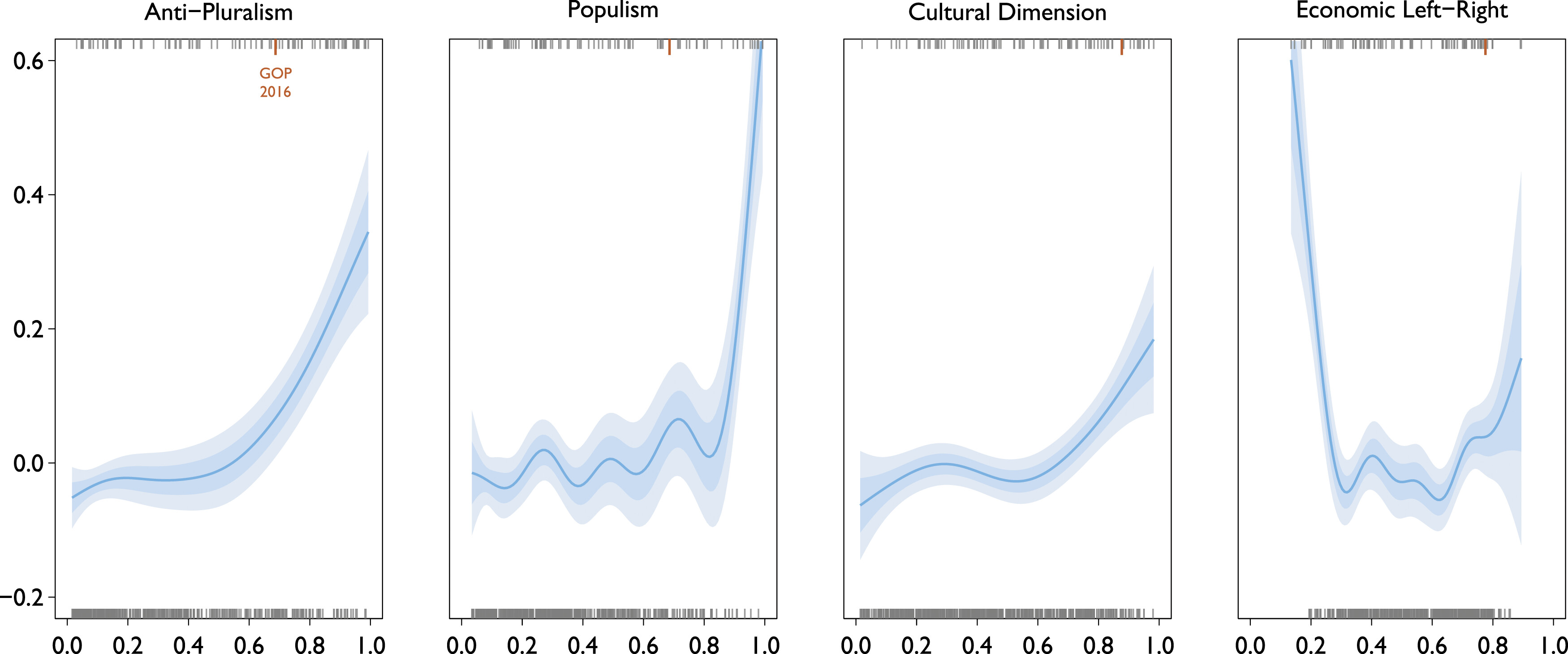 Figure 2 highlights the US Republican and Democratic parties on two dimensions: anti-pluralism and left-right positioning on economic policy, with other parties positioning at the last election in relief. The Republican party has not changed its left-right placement but moved strongly in an anti-pluralist direction reaching an API score of 0.69 in 2018. This reflects that Trump in his 2016 presidential campaign made personal, demonizing attacks on political opponents leading to a high score of 0.86 on the demonization indicator (see