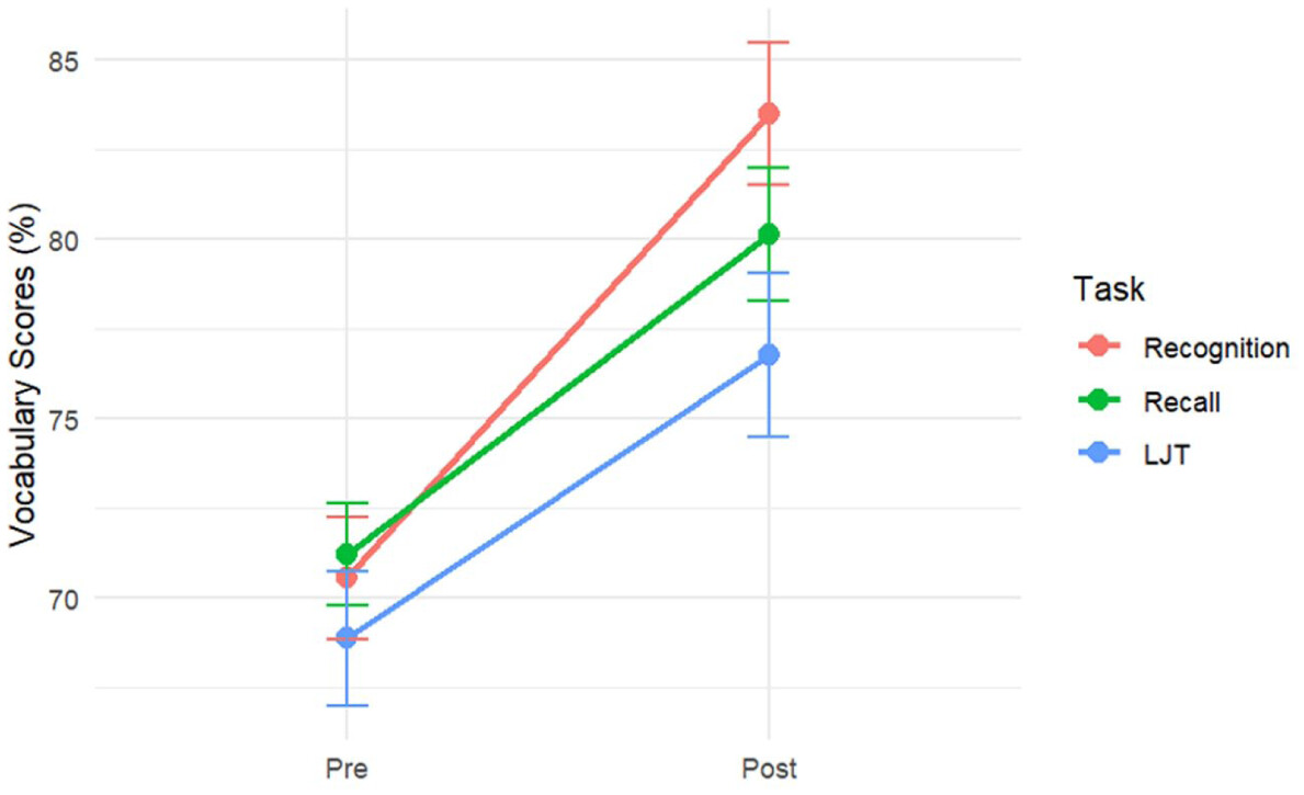 Schmitt’s (2019) methodological synthesis of L2 vocabulary research, it was noted that the vast majority of studies have concentrated almost exclusively on form–meaning mapping – typically assessed through meaning recognition and recall tasks (for methodological foundations and distinctions between recognition and recall, see
